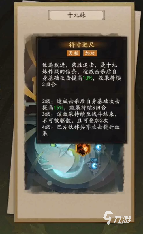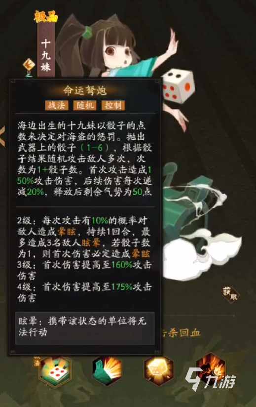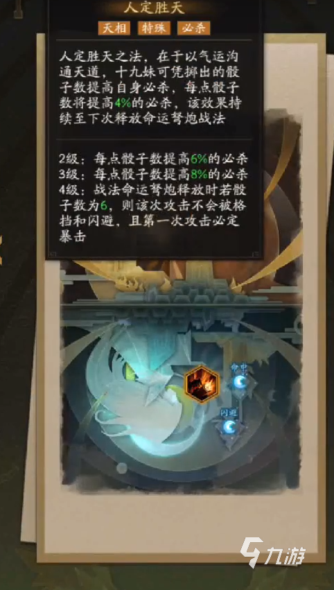 被動(dòng)技能,該技能和天相技能是互動(dòng)的,骰子的數(shù)值越高,可以帶來必殺的百分比提升。同時(shí)天相技能還會(huì)根據(jù)骰子的數(shù)值來獲得攻擊力的提升,但是這個(gè)提升要擊殺之后獲得。