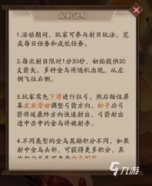 先來說一說參與方式,參與玩法的話要等級二十五級,開啟之后進入到活動界面來進入。在活動玩法中點擊最下方的出擊就可以開始了,在玩法中通過操控后羿的弓箭來射金鳥獲得積分的獎勵?;镜耐娣ê托∮螒虿畈欢嗟?,難度也不高的。那么在射日的玩法中,也是有一些機制設定的,大家要了解好。