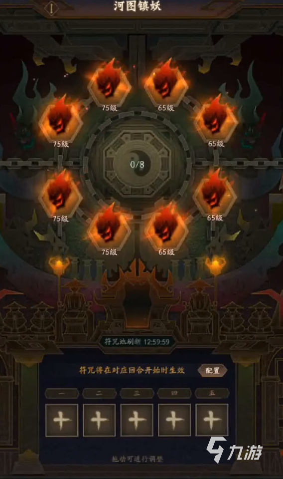 當玩家通過所有的妖獸挑戰(zhàn)之后,那么就會解鎖中央的巨妖挑戰(zhàn)。這個挑戰(zhàn)的話難度是相對較高的,在選擇符紙的時候大家要合理的進行搭配。建議大家選擇破盾和降低防御的金色符紙,可以讓戰(zhàn)斗的難度下降很多的。
