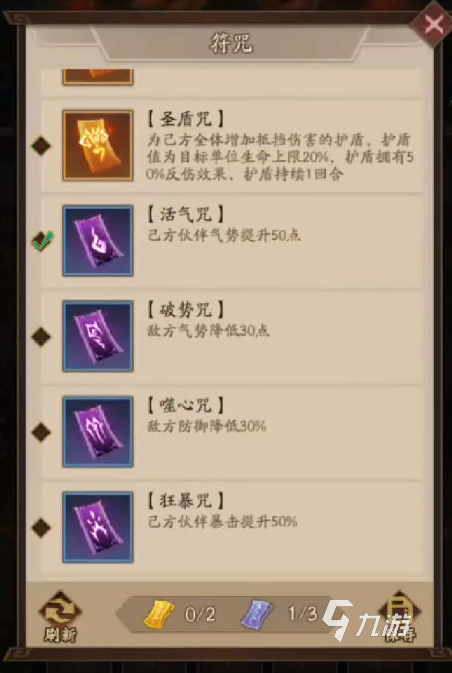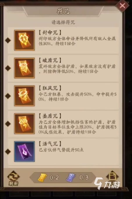 在解鎖該玩法之后,玩家可以獲得兩張金色符紙和三張紫色符紙,在對應的符紙界面中可以選擇對應的符紙來獲得加成。這個加成是有很多選擇的,玩家可以根據(jù)隊伍的需求或者說核心能力來進行搭配。通過符紙的提升之后,可以一定程度而定降低河圖鎮(zhèn)妖的通關難度。