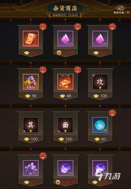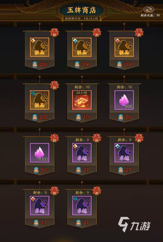 至于玉牌的用處,我們可以進(jìn)入玉牌商店,然后可以看見有雜貨和玉牌2個選項(xiàng)。點(diǎn)擊玉牌選項(xiàng),則可以看見可以購買的商品,玩家也可以選擇消耗1000元寶來選擇一次刷新。