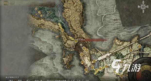 3、三次遇到女巫的地方也離這兒不遠(yuǎn),我們沿著道路來到利耶尼亞東邊,來到這里以后,先找到我們的賜福點(diǎn),然后以這里為坐標(biāo)找到門前鎮(zhèn)大橋,因?yàn)槭亲髽?,所以這里非常好找,通過我們的地圖里就可以直接定位到這個(gè)大橋的位置。