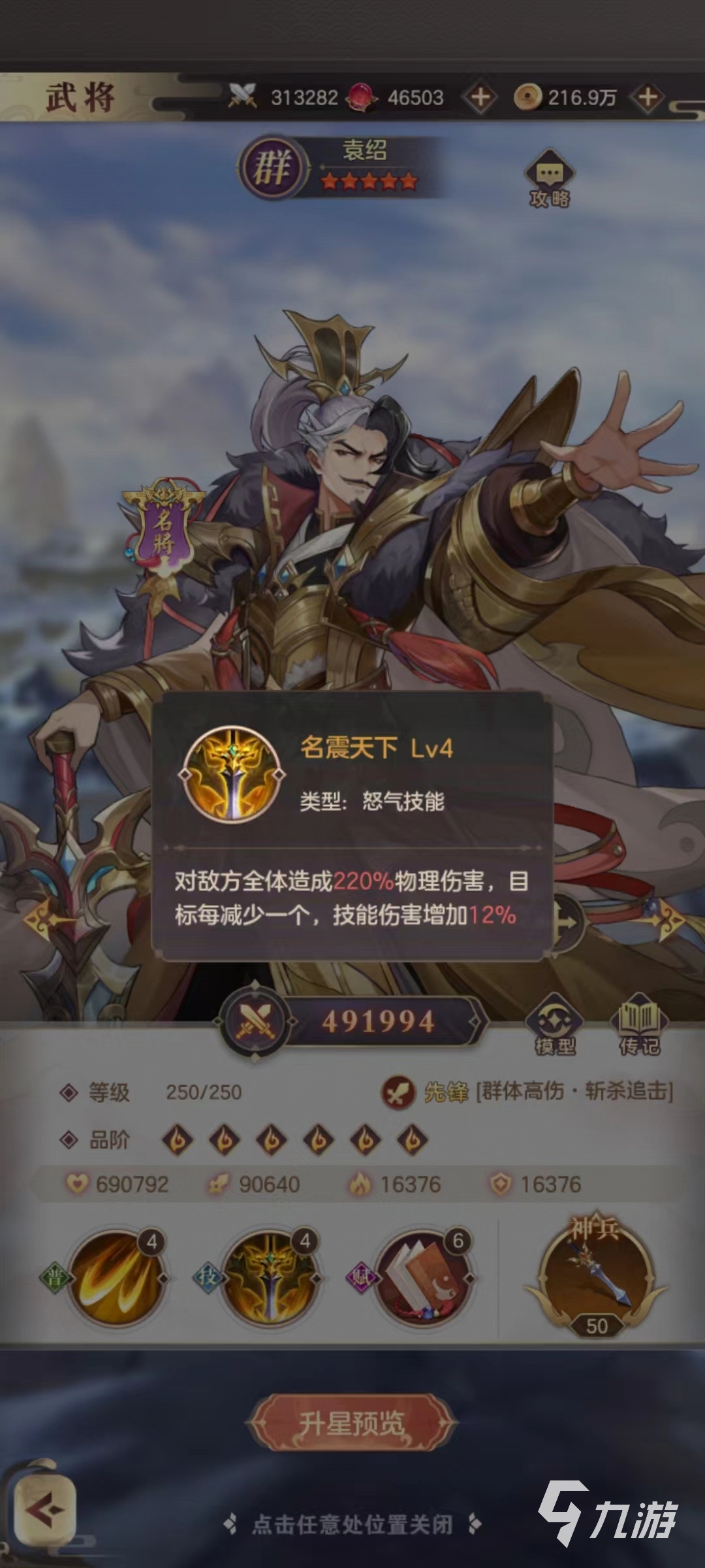 排名第三的是袁紹,論輸出總量擅長群攻的袁紹肯定最高,但是在效果上就不如前兩個(gè)。普攻技能誅滅,可以選擇敵方人數(shù)最多的一排造成物理傷害,怒氣技能名震天下,直接對(duì)敵方全體造成一次輸出,并且敵方目前存活目標(biāo)越少,則技能傷害越高。是一個(gè)在后期可以群體收割的角色,最為重要的是自身達(dá)到10星天賦時(shí),只要能擊殺一名敵方武將,就可以提高傷害加成,最多可以疊加三次。所以袁紹也是一個(gè)越戰(zhàn)越勇的武將。