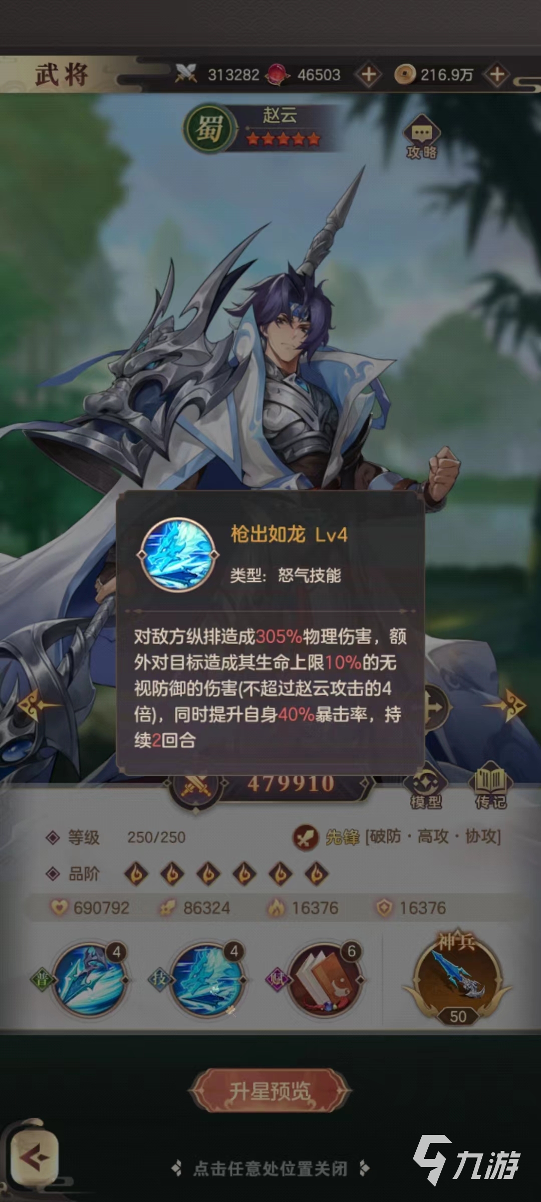 排名第二的是趙云,如果單論輸出或許趙云還在呂布之上,但是他沒有呂布那么肉,只能區(qū)居第二。主要特點(diǎn)是可以進(jìn)行破防,以及自身暴擊率比較高,普攻技能龍槍傷害敵方單體武將,怒氣技能槍出如龍對(duì)縱排造成一次極高物理傷害,并且額外附加一次無視防御傷害效果。技能使用后趙云自身暴擊率提升,能夠持續(xù)兩個(gè)回合,在接下來就能做到槍槍必爆擊。激活十星天賦后趙云還能為己方全體武將提高暴擊率,光環(huán)效果很棒。
