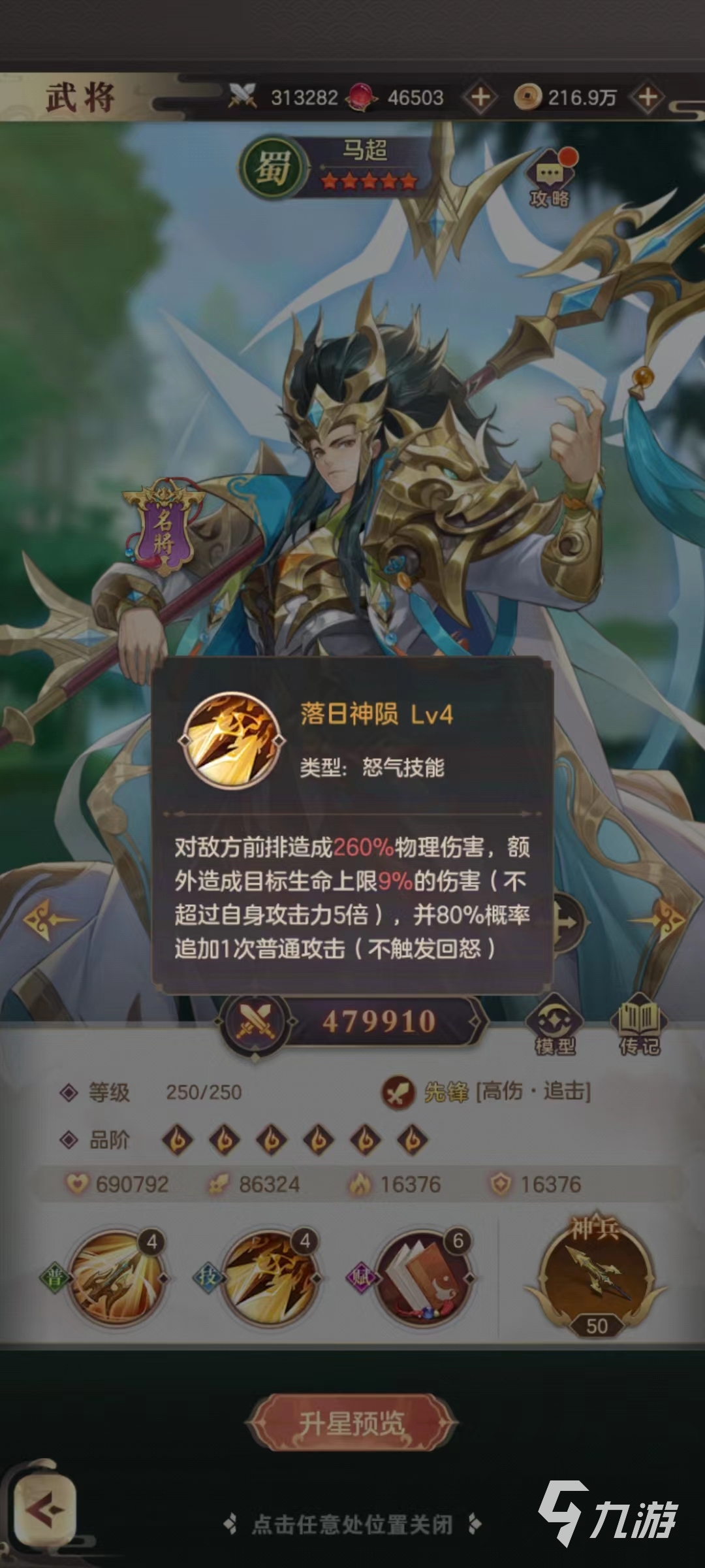 排名第四的是馬超,能夠以極高的傷害進(jìn)行攻擊,同時(shí)附加追擊效果,普攻技能破天,是當(dāng)前單體傷害最高普攻技能。怒氣技能落日神隕,直接傷害敵方前排,同時(shí)造成一次額外傷害,數(shù)值和敵方生命值相關(guān)。所以馬超最喜歡遇到的就是肉盾陣容,直接打穿對(duì)方防御陣線,在技能釋放后還有極高幾率追加一次普攻。自身達(dá)到十星天賦時(shí),使得怒氣技能可以無視敵方護(hù)盾和無敵效果,這一點(diǎn)對(duì)當(dāng)前流行護(hù)盾流和無敵流是很好的克制。