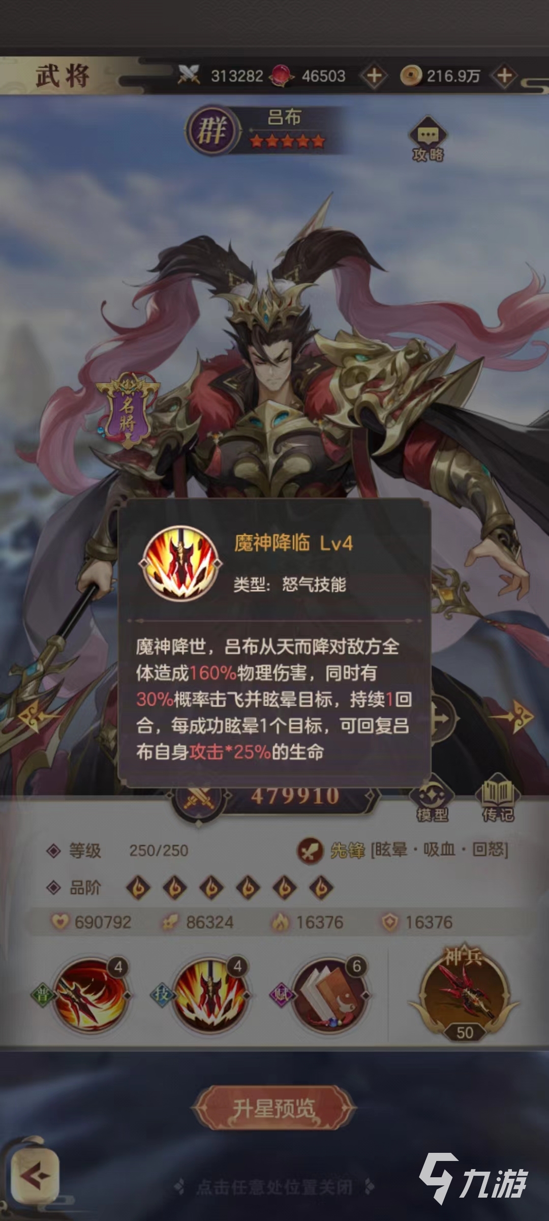 目前排名第一的當(dāng)之無愧屬于呂布,這名來自群雄陣營的強(qiáng)力武將擅長眩暈、吸血和回復(fù)怒氣。自身普通技能浴血,直接傷害對(duì)方前排所有單位,怒氣技能魔神降臨,跳起之后重重落下來對(duì)敵方全體武將造成一次高額物理傷害,并且有一定幾率將傷害目標(biāo)擊飛同時(shí)眩暈。被眩暈敵人在一回合之內(nèi)無法進(jìn)行任何行動(dòng),如果成功眩暈對(duì)方,那么呂布獲得生命值回復(fù)。在激活了十星天賦后還會(huì)附加降低怒氣效果。所以現(xiàn)在呂布經(jīng)常被用來當(dāng)做單核,甚至有些極端玩家只上陣一名武將那就是呂布,效果出奇好。