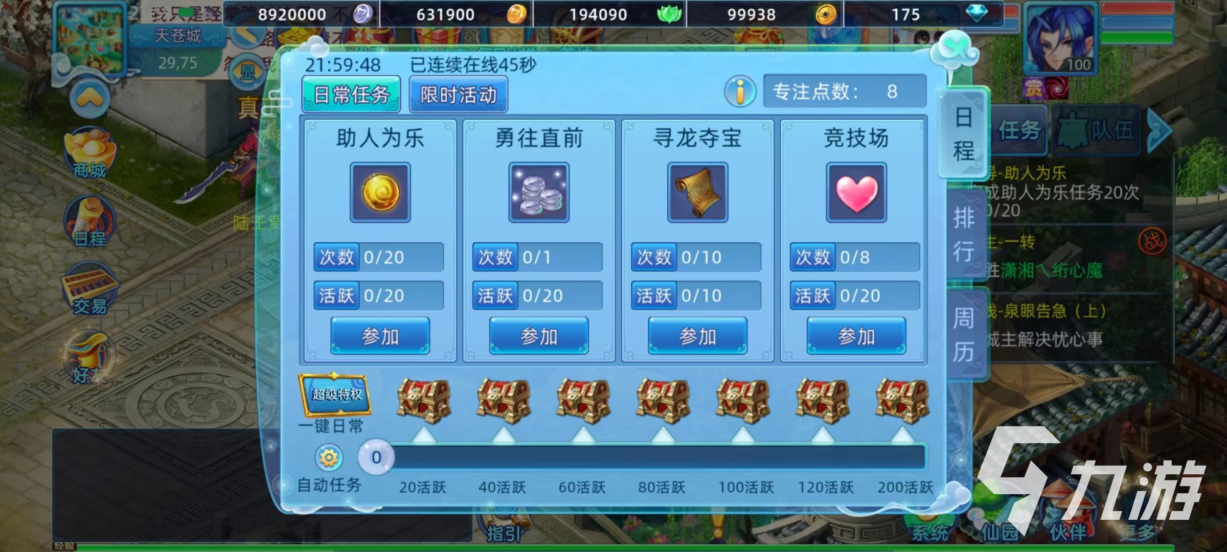 除了常見主線和支線任務(wù)外,每天還提供了日常活動和限時活動等類型。包括有打?qū)殘D、參加競技場、參加科舉答題和做環(huán)任務(wù),以及挑戰(zhàn)蟠桃盛會,幫派boss,武林大會等。還能夠在地圖中找到實力強(qiáng)悍的星宿,擊殺他們獲取高額獎勵。