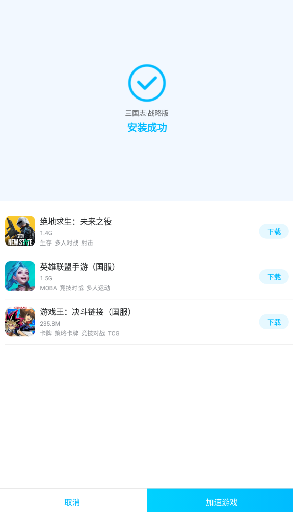 玩家在完成了游戲的下載之后,就可以進(jìn)入到游戲安裝界面了,玩家點(diǎn)擊該界面中的安裝選項(xiàng),就可以開始游戲的安裝了,完成了游戲的安裝之后,玩家就進(jìn)入了安裝成功界面,點(diǎn)擊該界面中的加速游戲選項(xiàng),就可以開始游戲加速了。