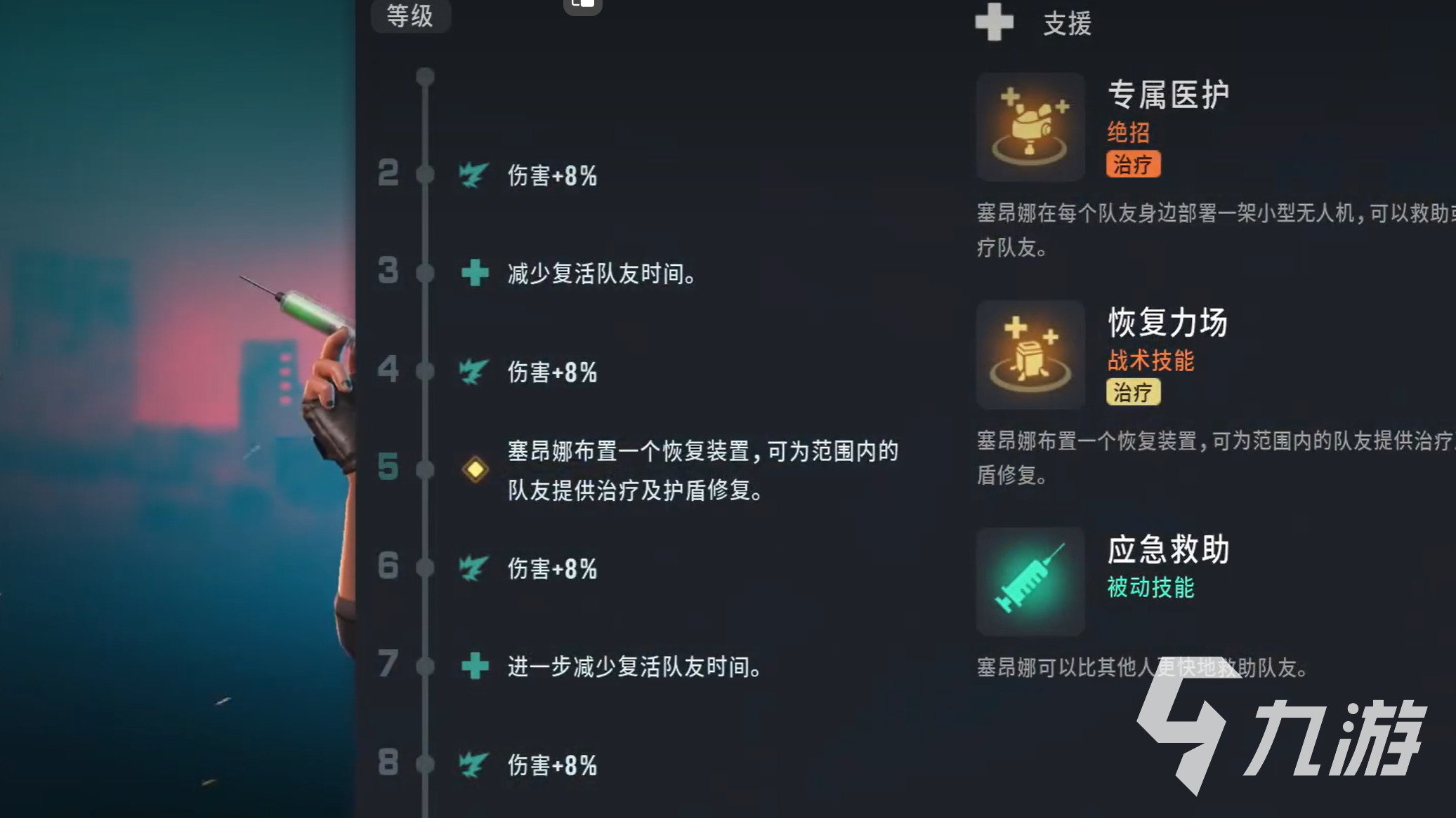 賽昂娜的核心特點(diǎn)在于其出色的輔助與治療能力。她擁有三個(gè)主要技能,分別是位移技能“噴氣疾閃”、治療技能“恢復(fù)力場(chǎng)”以及終極技能“專(zhuān)屬醫(yī)護(hù)”?!皣姎饧查W”可以讓賽昂娜快速前移,既能躲避敵方攻擊,也能快速調(diào)整位置,為隊(duì)友提供更好的保護(hù)。技能冷卻時(shí)間較短,升級(jí)天賦后冷卻更低,使得賽昂娜在戰(zhàn)場(chǎng)上的機(jī)動(dòng)性大大提升,能夠靈活應(yīng)對(duì)各種突發(fā)狀況。