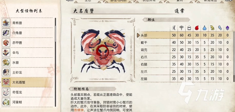 其實,對盾蟹的背殼破壞2次,就有很大的概率獲得深紅角。但不少覺得破殼很麻煩,所以這里介紹一種方法。從肉質(zhì)表可以用看到背殼乃至全身吸收的都是打擊系的武器最高,所以帶上錘子進(jìn)行破壞會比較好。
