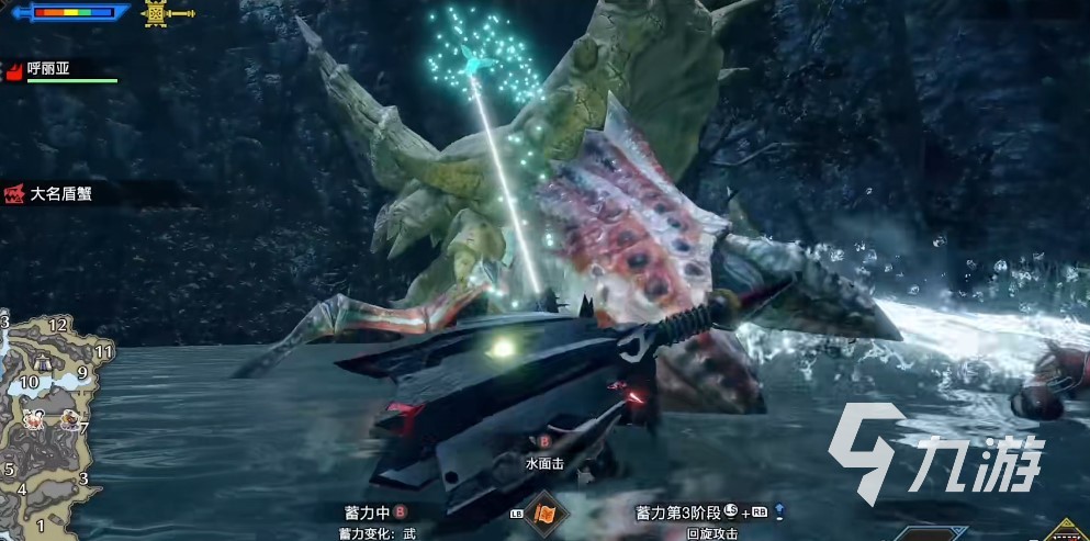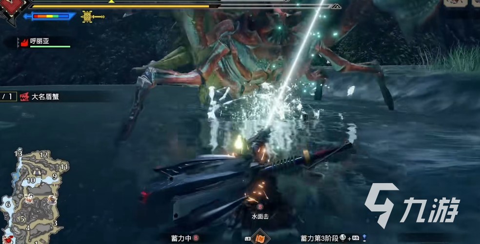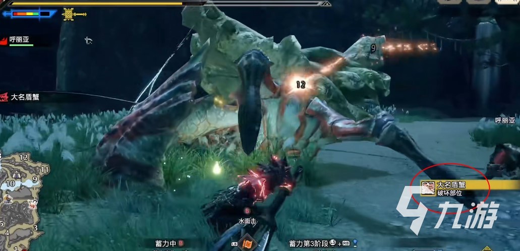遇到大名盾蟹,使用鐵蟲回旋攻擊這一招。螃蟹的身體和腳這兩個部位是容易打出失衡效果的。然后利用失衡的空檔來輸出,與此同時蟲技還可以快速積累馭龍值。