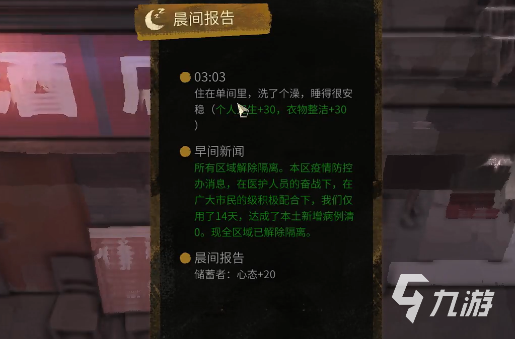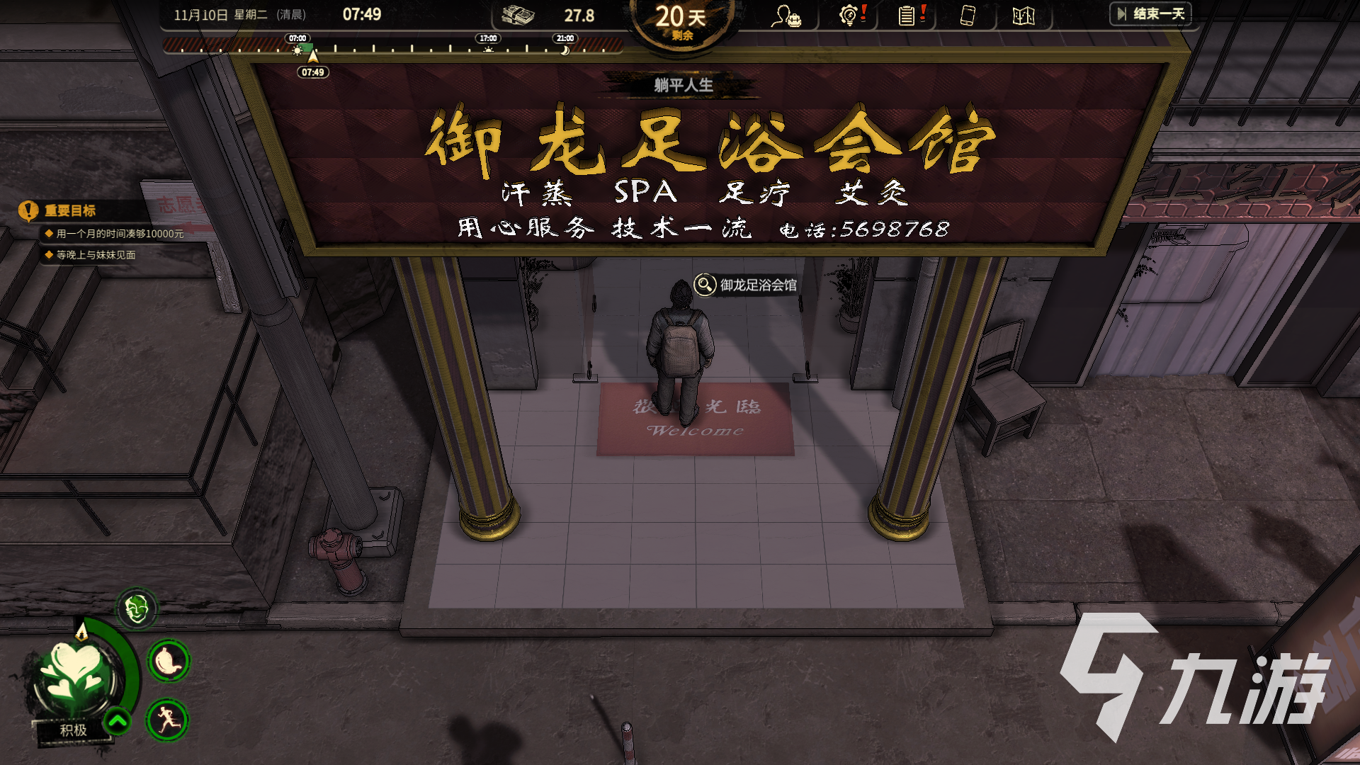 在游戲前期時(shí),由于疫情原因,地圖上方的生活區(qū)是封鎖的,角色無(wú)法進(jìn)入。在第九天早上醒來(lái)后,我們可以通過(guò)晨間報(bào)告得到游戲所有區(qū)域解除隔離的消息,這時(shí)我們就可以進(jìn)入這片生活區(qū)域了,而我們要說(shuō)的御龍足浴會(huì)館也在這片區(qū)域中。