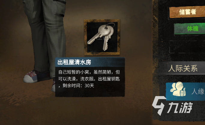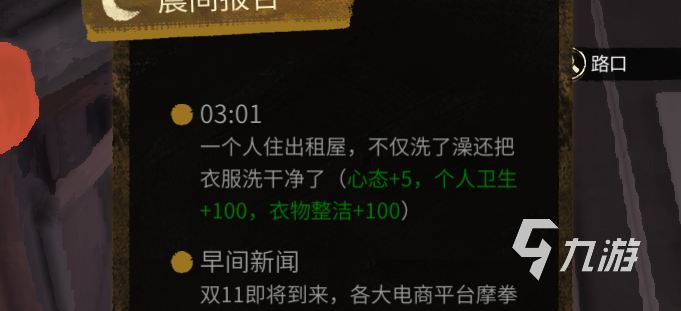 在租房中休息,每晚都會回復(fù)一百點(diǎn)衣物整潔度和一百點(diǎn)個(gè)人衛(wèi)生,這樣玩家基本就不用擔(dān)心因角色衣物整潔度或個(gè)人衛(wèi)生數(shù)值過低而帶來的不利影響了。