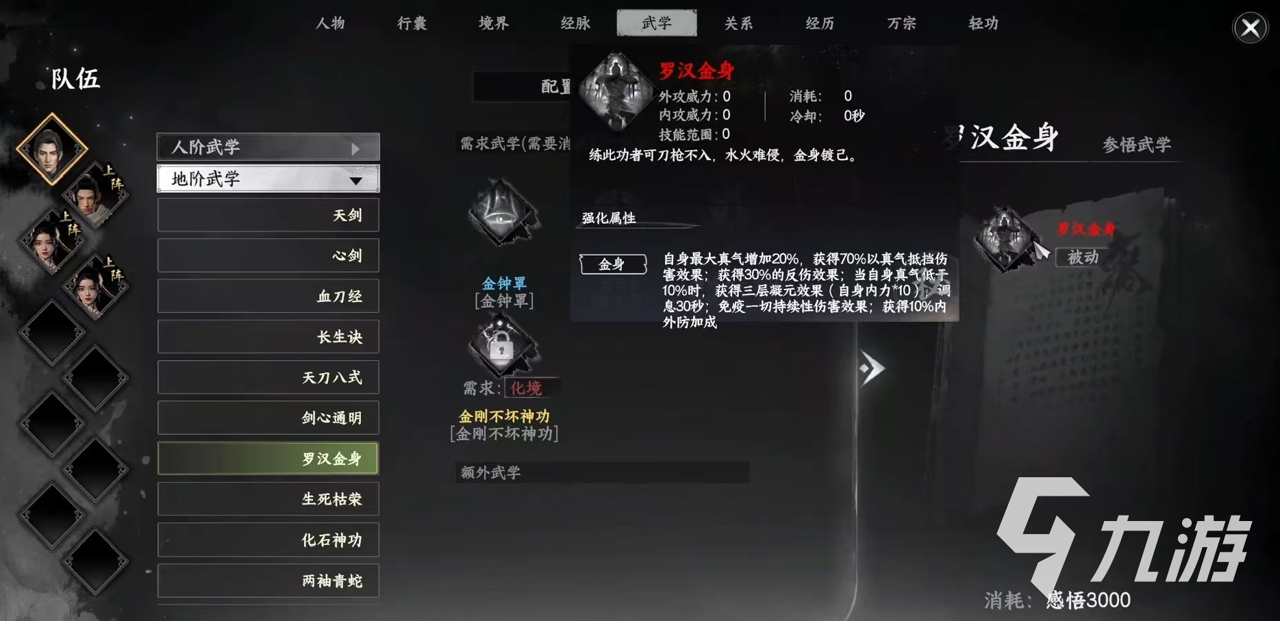 具體操作步驟是打開武學(xué),然后找到武學(xué)參悟,在人階武學(xué)這里就可以直接找到金剛不壞神功。所需求的三種武學(xué)就是上面所說的三種,但是它們還有另外三個名稱,可能大家更加熟悉,是二郎擔(dān)山、壯士開山和枯心定禪。二郎擔(dān)山對應(yīng)的就是嵩室棍法,壯士開山對應(yīng)的就是渡蜀掌,枯心定禪對應(yīng)的就是參嚴(yán)掌。這三種功法都需要修煉到化境,滿足要求之后直接點擊,確定消耗2000點感悟就可以自動得到。但是在領(lǐng)悟了金剛不壞神功之后并不算結(jié)束,大家還需要再進(jìn)行進(jìn)一步操作,達(dá)成羅漢金身,這是金剛不壞神功的最佳效果。同樣是在嵩室山長老這里獲得任務(wù)。在金剛不壞神功達(dá)到化境之后,同時獲得武學(xué)金鐘罩、鐵布衫與橫練十三太保,就可以得到羅漢金身。