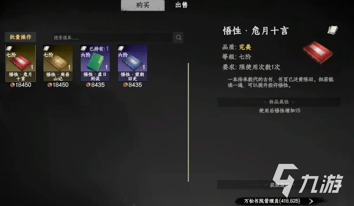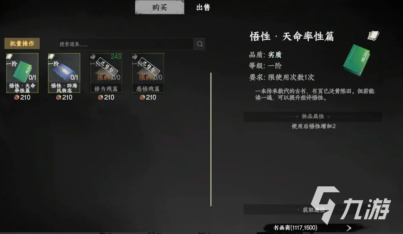 首先第一種方法就是購(gòu)買,大家靠著探索、戰(zhàn)斗有了充足資金后,就可以到1116.1500找到書畫商購(gòu)買加悟性的書,比方說(shuō)悟性天命率性篇,就能購(gòu)買使用后提升2點(diǎn)悟性,此外到723.767處,找到柯昭陽(yáng)也可以購(gòu)買帶提升效果的銀氣散、亦夜丹,這兩種丹藥總共可以加7點(diǎn)。