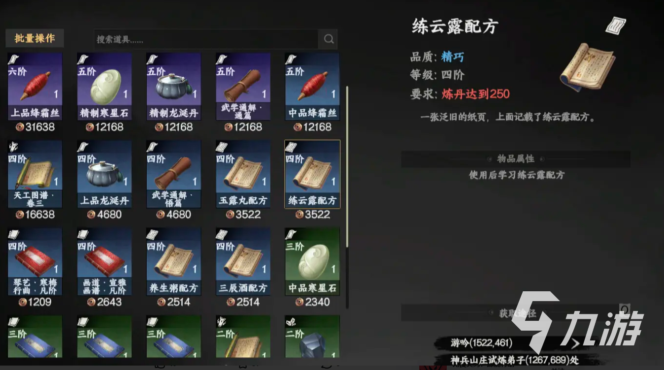 最后一種關(guān)鍵途徑是自己煉制,大家可以前往1522.461處找到游吟購(gòu)買一下練云露配方,再去1086.1036購(gòu)買煉制材料天仙子和丹皮,就可以開始煉制了,需要注意如果大家的煉丹點(diǎn)數(shù)不夠,可以去買低階的配方去批量煉制提升,然后再去制作練云露。