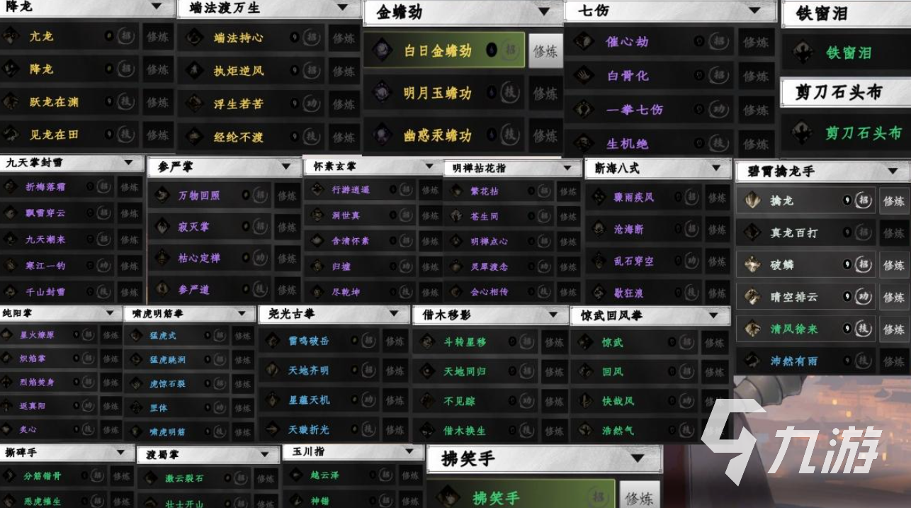 作為近戰(zhàn)物理武學(xué)的代表,整體設(shè)計上更注重節(jié)奏把控與技能連貫。例如“降龍心訣”結(jié)合了身份系統(tǒng)的使用,需要玩家以行者身份在特定場景中搶奪物品并完成多次化緣,才有機會觸發(fā)獲?。弧捌邆眲t通過支線任務(wù)“相濡以沫”完成特定條件后獲得;而“斷海八式”“純陽掌”等強力拳法更融合了解密、道具搜集與劇情判斷等多重機制。