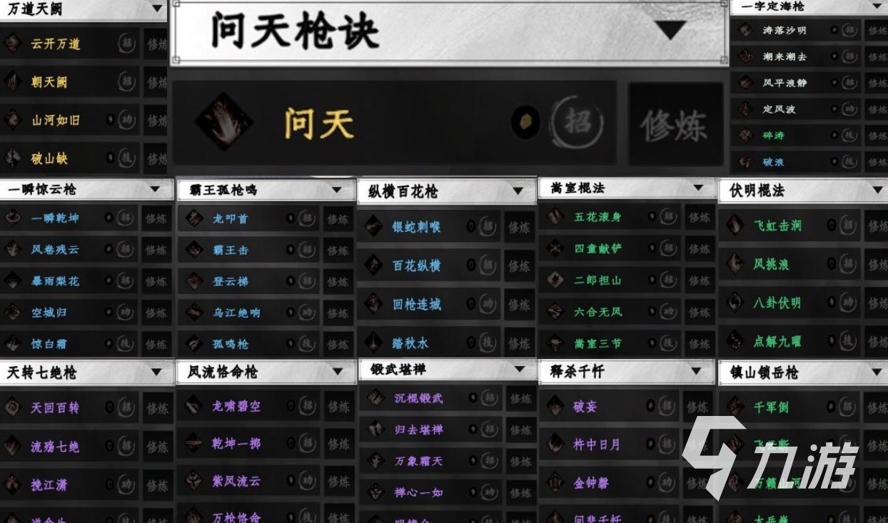 本作中偏重于范圍攻擊與控制能力,其中不乏高連擊、遠(yuǎn)程壓制的招式,比如“風(fēng)流恪命槍”與“天轉(zhuǎn)七絕槍”。頂級槍法“萬道天闕”與“問天槍訣”分別來自不夜京兌換與主線高難任務(wù),特別是后者涉及與義軍、駱星等角色的交互選擇,若劇情中處理不當(dāng)將直接失去獲取機會。
