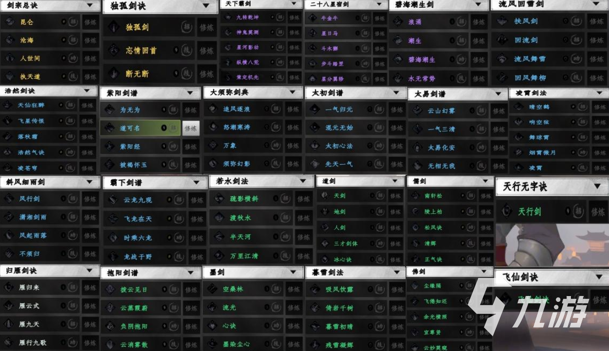 作為武學(xué)中最具代表性的流派之一,擁有數(shù)量龐大的劍譜。從基礎(chǔ)的“綠.飛仙劍訣”、“歸雁劍訣”到進(jìn)階的“藍(lán).凌霄劍法”、“藍(lán).大須彌劍典”,再到傳說級的“金.獨孤劍訣”、“金.劍宗總訣”,劍法譜系完整而豐富。