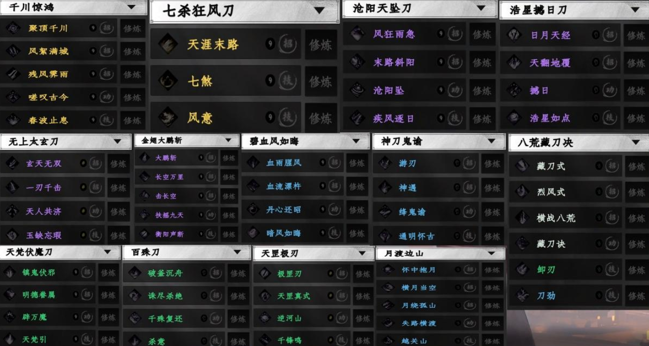 不少刀法主打高爆發(fā)與破防效果,適合快節(jié)奏的對戰(zhàn)風(fēng)格。“浩星撼日刀”、“無上太玄刀”等紫色品階刀法都具備不俗威力,而“金翅大鵬斬”、“七殺狂風(fēng)刀”這類金色武學(xué)則能在實戰(zhàn)中形成質(zhì)變,成為逆轉(zhuǎn)戰(zhàn)局的關(guān)鍵。其中,“千川驚鴻”不僅為刀法代表作之一,還同時能作為主線機關(guān)“神武將軍傳聞”系列解謎的終點獎勵。此外,一些特殊刀法如“天罡極刃”、“八荒藏刀訣”可通過打聽獲得,而“滄陽天墜刀”、“碧血風(fēng)如晦”等則融入支線任務(wù)與書院兌換機制,讓刀法玩家也能從探索中獲得成就感。