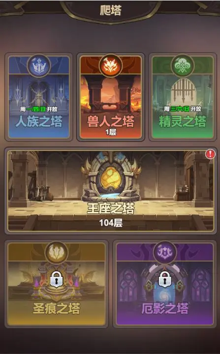這個(gè)案發(fā)是每日不限次數(shù)的,只要戰(zhàn)力達(dá)標(biāo)們就能持續(xù)挑戰(zhàn),一直到爬到塔的頂端,有6種不同的挑戰(zhàn)塔,分別是:王座之塔,人族之塔,獸人之塔,精靈之塔,圣痕之塔,厄影之塔。王座塔是可上陣任意陣營(yíng)英雄的,更為自由,其他的玩法都有對(duì)王座層數(shù)的要求,還有具體開(kāi)放日期的限定,在限定時(shí)間內(nèi)才能參與對(duì)應(yīng)類(lèi)型的爬塔。