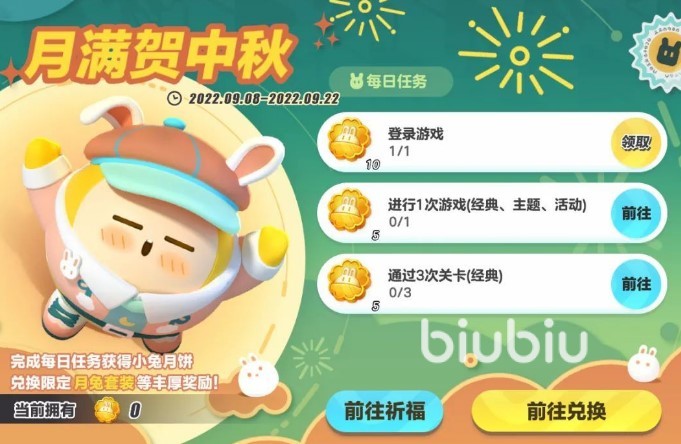 這次主題活動會在九月八號上線,一直持續(xù)到九月二是二號,第一個是中秋任務,每天玩家上線或者完成一定次數(shù)的對局都可以領到兔兔餅,這個兔兔餅能直接在商店中兌換道具和一個限定時裝“中秋兔兔外套”,不過兔兔餅會在活動結束后過期,所以大家一定要記得及時使用哦。