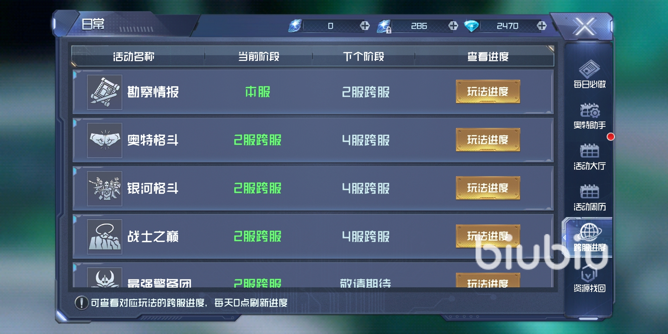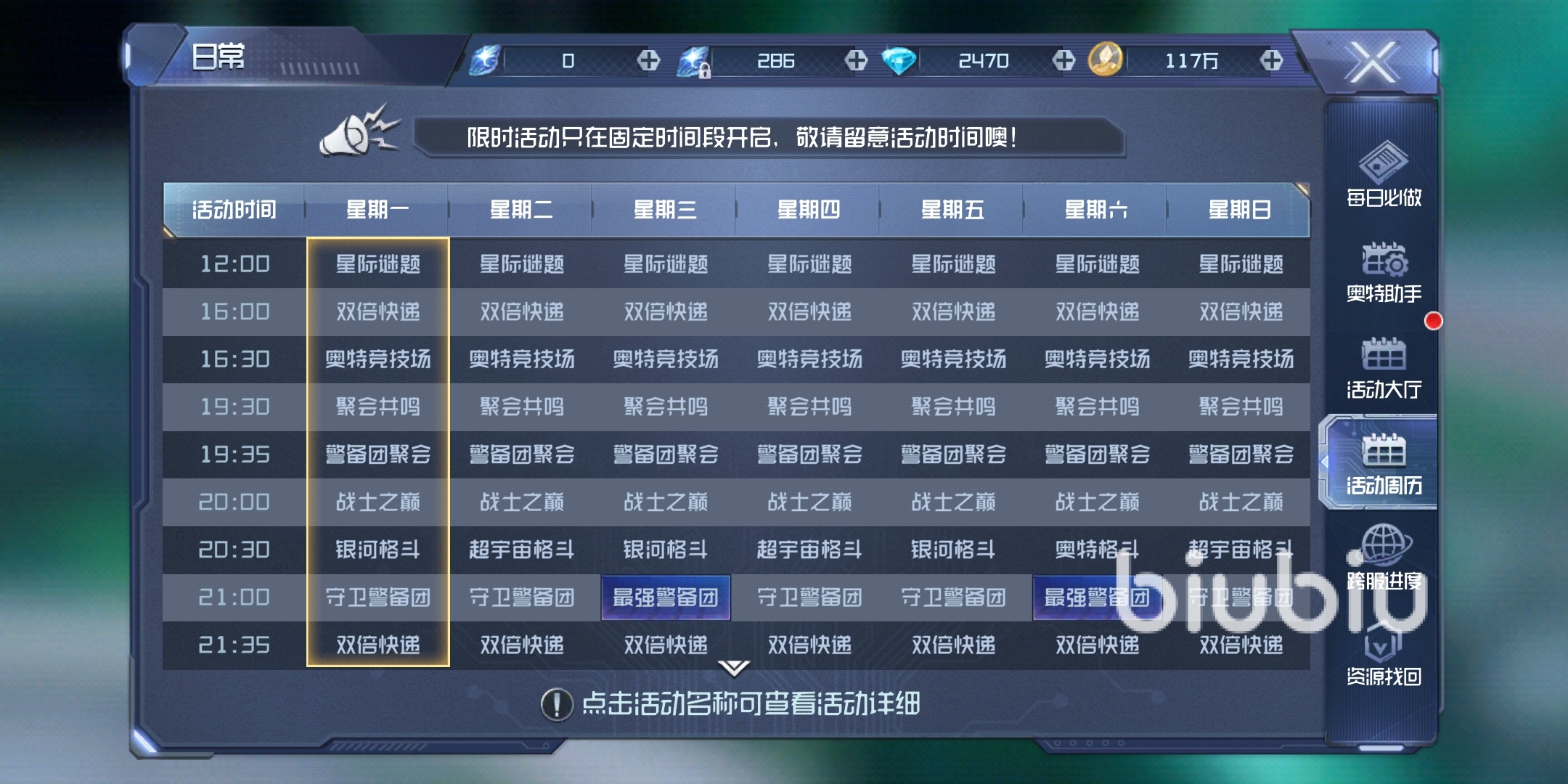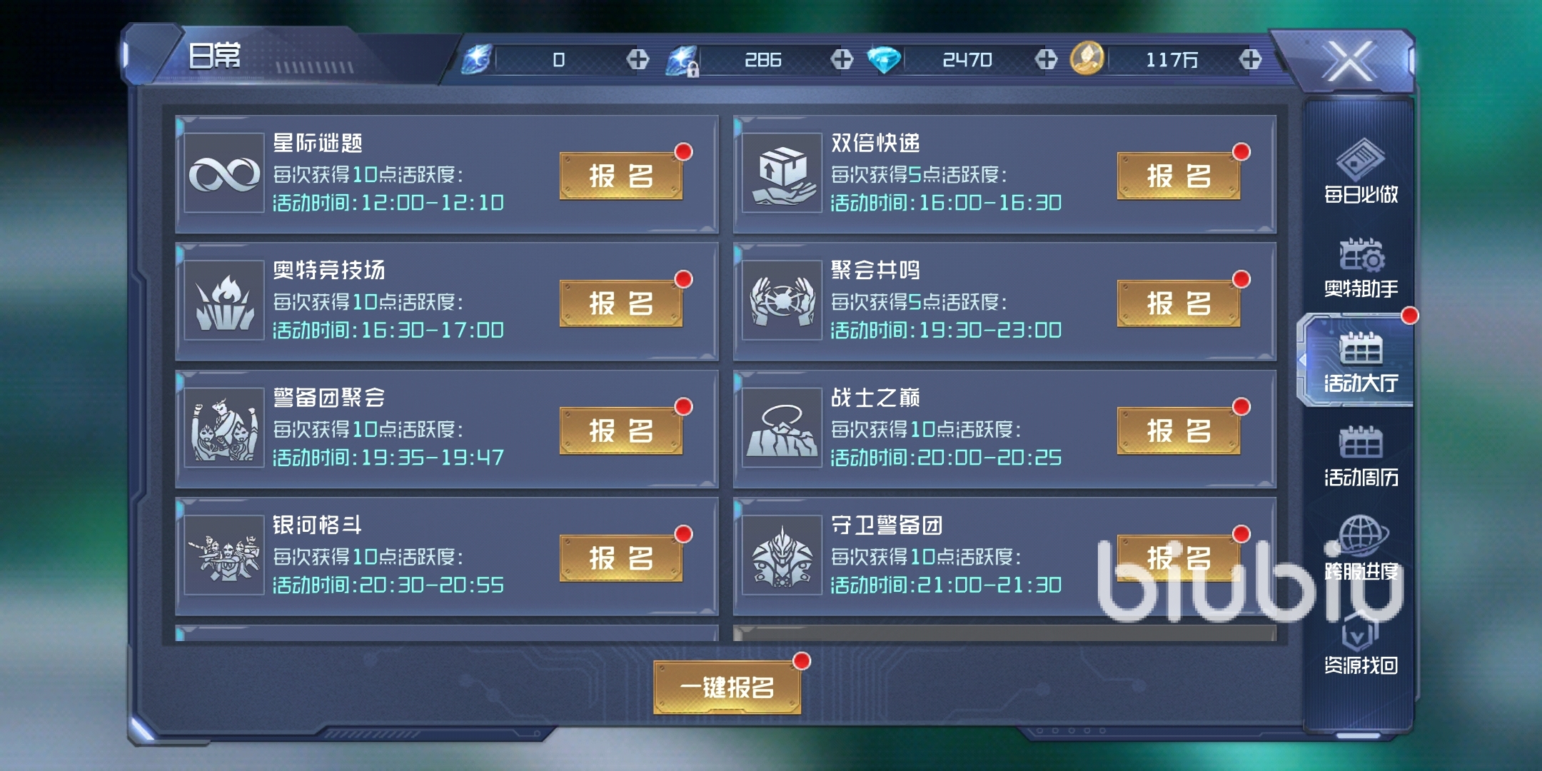 【活動大廳】會顯示每日的限時活動列表,游戲上的所有限時活動都能在這里直接查看,下面還有一鍵報名的按鈕。