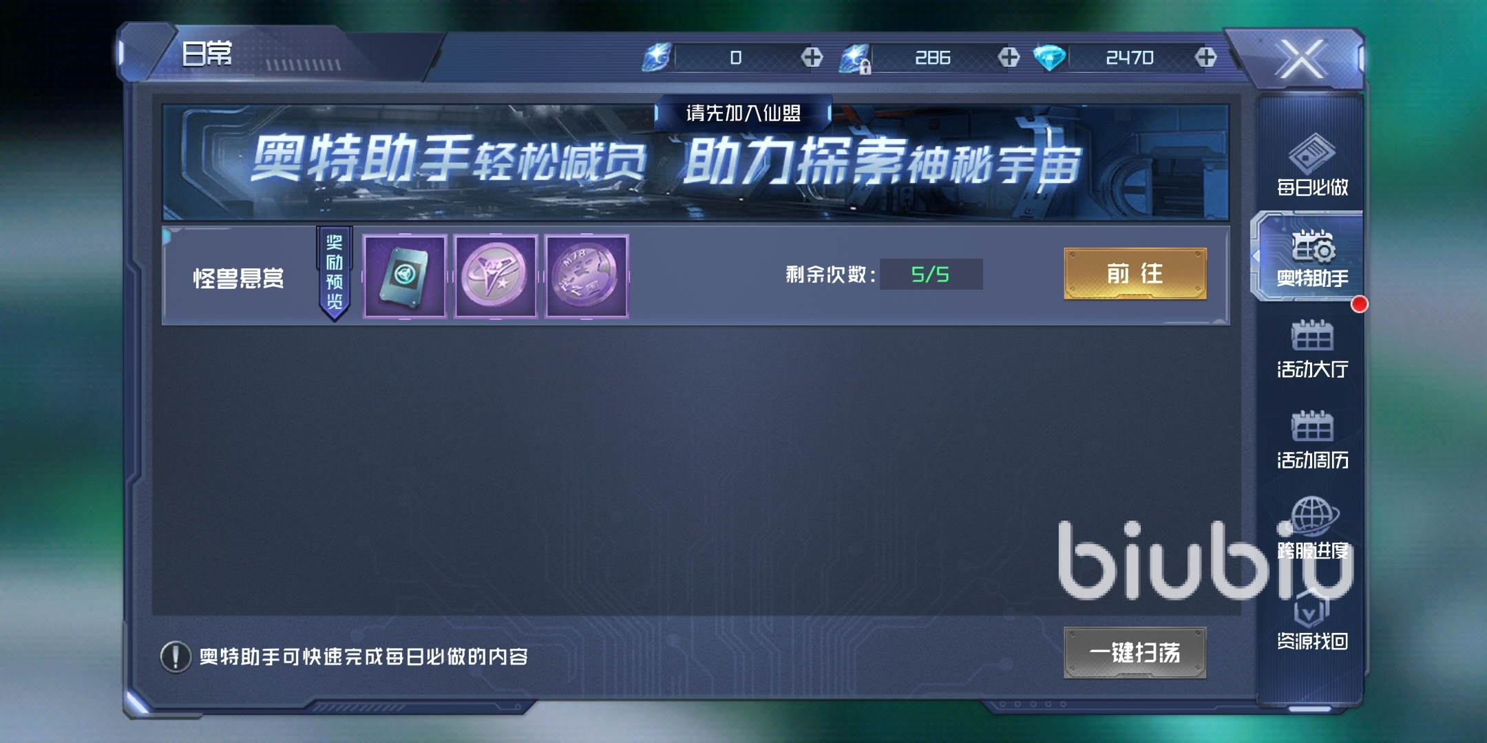 【奧特助手】的任務是直接對接【怪獸懸賞】,前提必須要加入仙盟,應該就是警備團了,每天擁有5次免費的掃蕩次數(shù)。