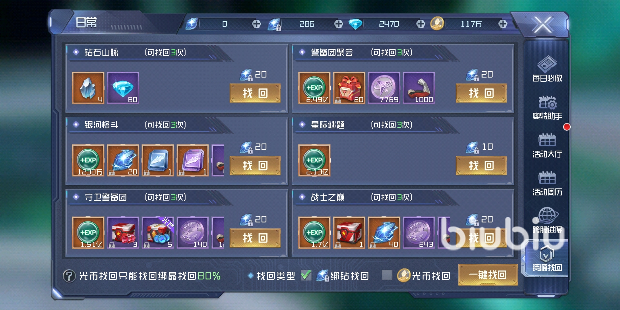 2、消耗光幣只能挽回80%錯過獎勵,消耗綁晶可挽回100%錯過獎勵
