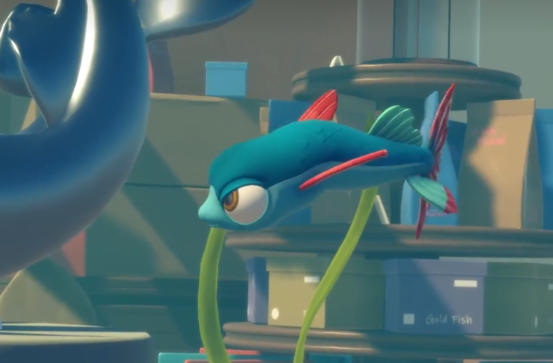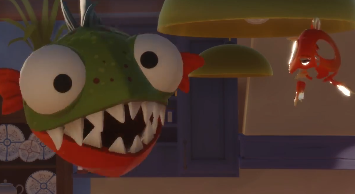 一開始劇情是在一個(gè)很普通的屋子里面,在劇情結(jié)束之后我們便可以自由行動(dòng)了。我們現(xiàn)在的所在地是冰箱,首先我們需要從冰箱之中下來。在下來之后我們的金魚缸會(huì)碎掉,但是沒關(guān)系,旁邊就是水池。我們首先拿到收集物,然后咬破水管上的物品,這樣等會(huì)水便會(huì)充滿這整個(gè)房間之中。