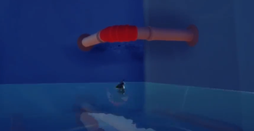 在充滿房間之后,玩家們便可以直接跳入下方了。在跳入后我們首先需要先打開下面的面板。這個(gè)面板里面所連接的便是水管,而現(xiàn)在我們的任務(wù)所需要做的就是咬下這個(gè)水管,然后讓整個(gè)房間的水再多一些。