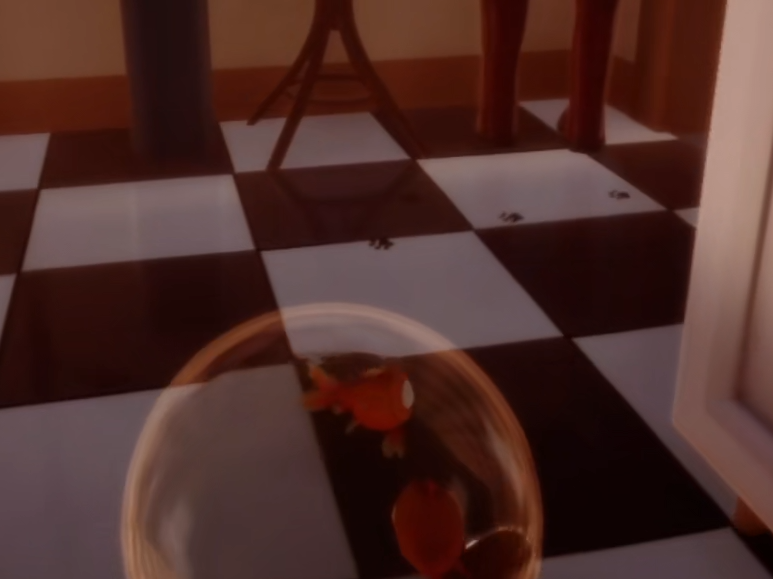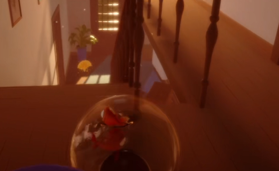 在前進(jìn)的時(shí)候我們會(huì)觸發(fā)劇情,之后我們會(huì)進(jìn)入到旁邊的屋子,同時(shí)進(jìn)入魚缸。在進(jìn)入之后可以不慌下樓,在二樓的最前方會(huì)有著一片面包。在拿上之后我們?cè)傧聵?,然后從虛掩著的那道門推開進(jìn)入。