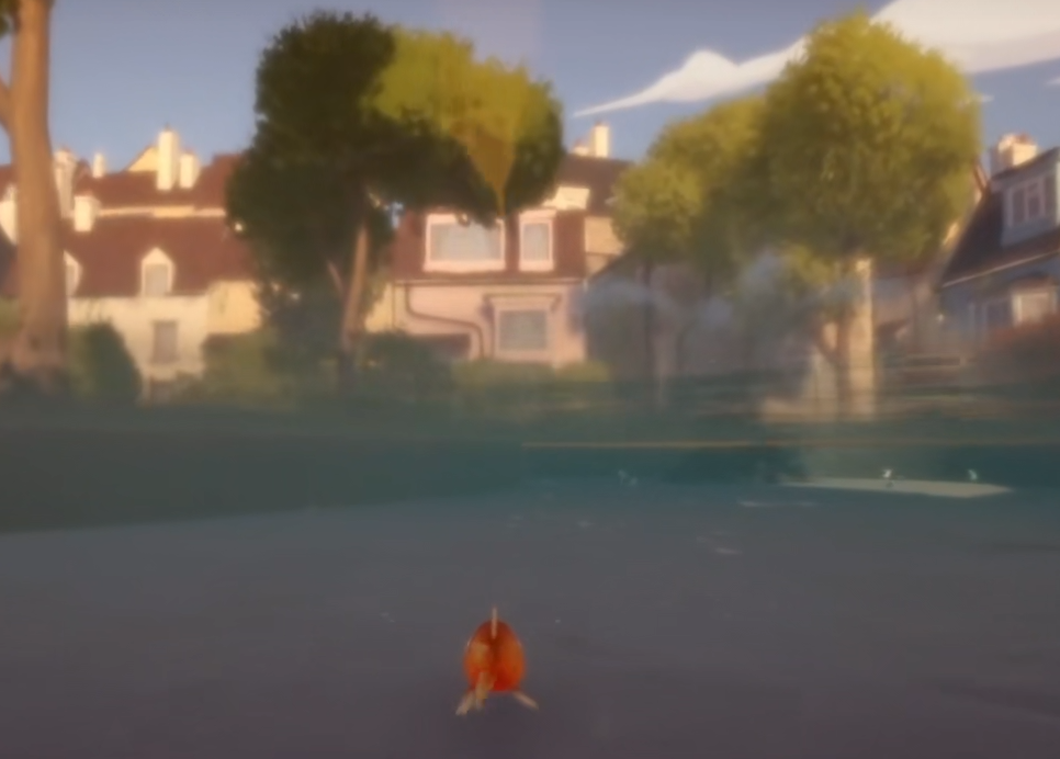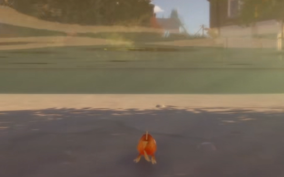 一開始我們進(jìn)入游戲之后會(huì)在水塘里面,從場(chǎng)景來看是別墅前方的水塘。在這個(gè)池塘里面會(huì)有一個(gè)面包片,我們需要往相反的方向過去先拿到面包片。之后我們朝著別墅的方向進(jìn)行移動(dòng),然后會(huì)看到有一個(gè)洞口,我們從洞口進(jìn)入,然后水壓便會(huì)將我們給彈射到房子上方的水管里面,之后我們向右邊前進(jìn)。