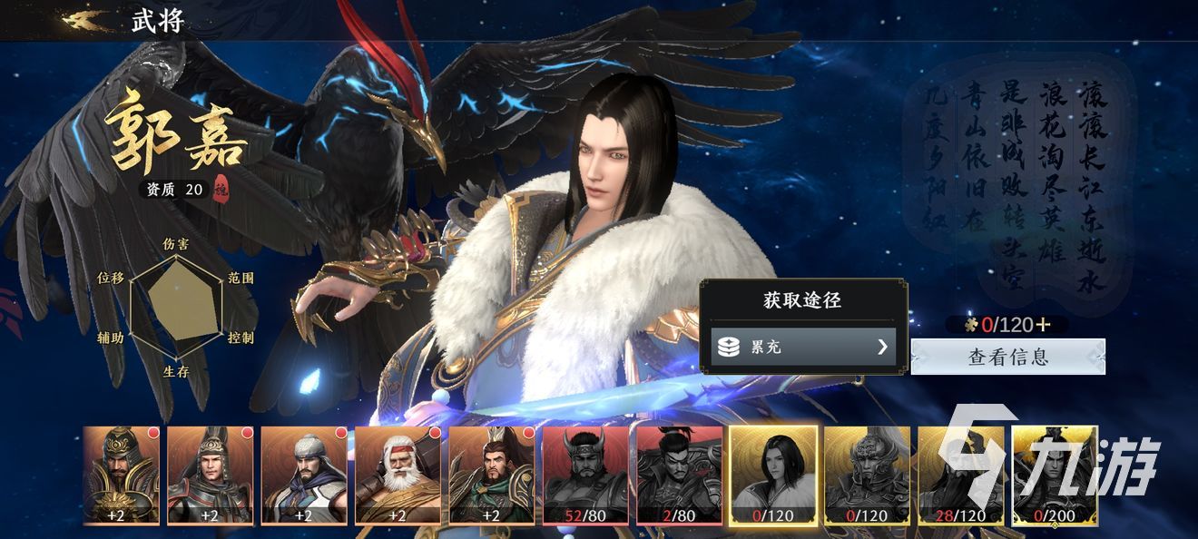 第二個便是郭嘉,郭奉孝。這個平民玩家也不容易獲得,需要1k的累充才可以獲得,資質(zhì)20,也是很好的角色。