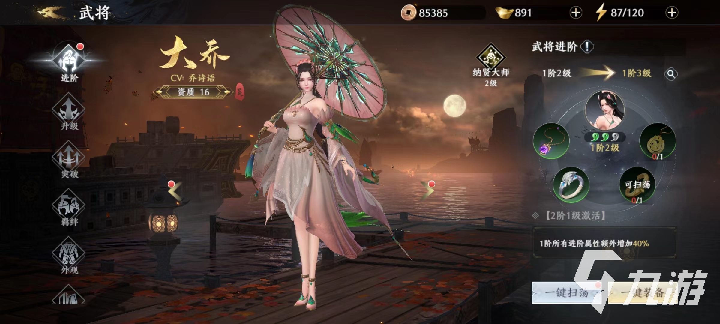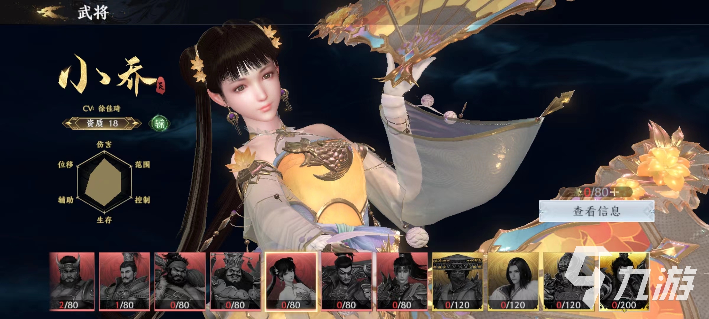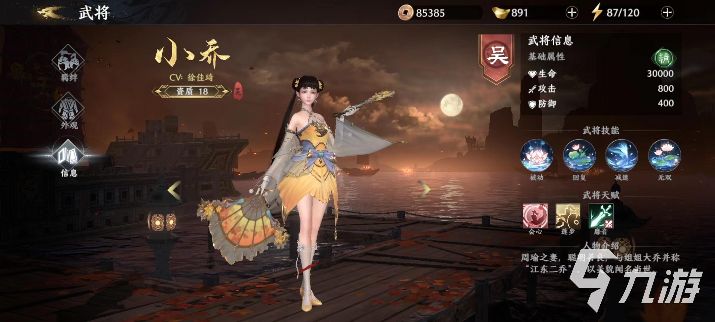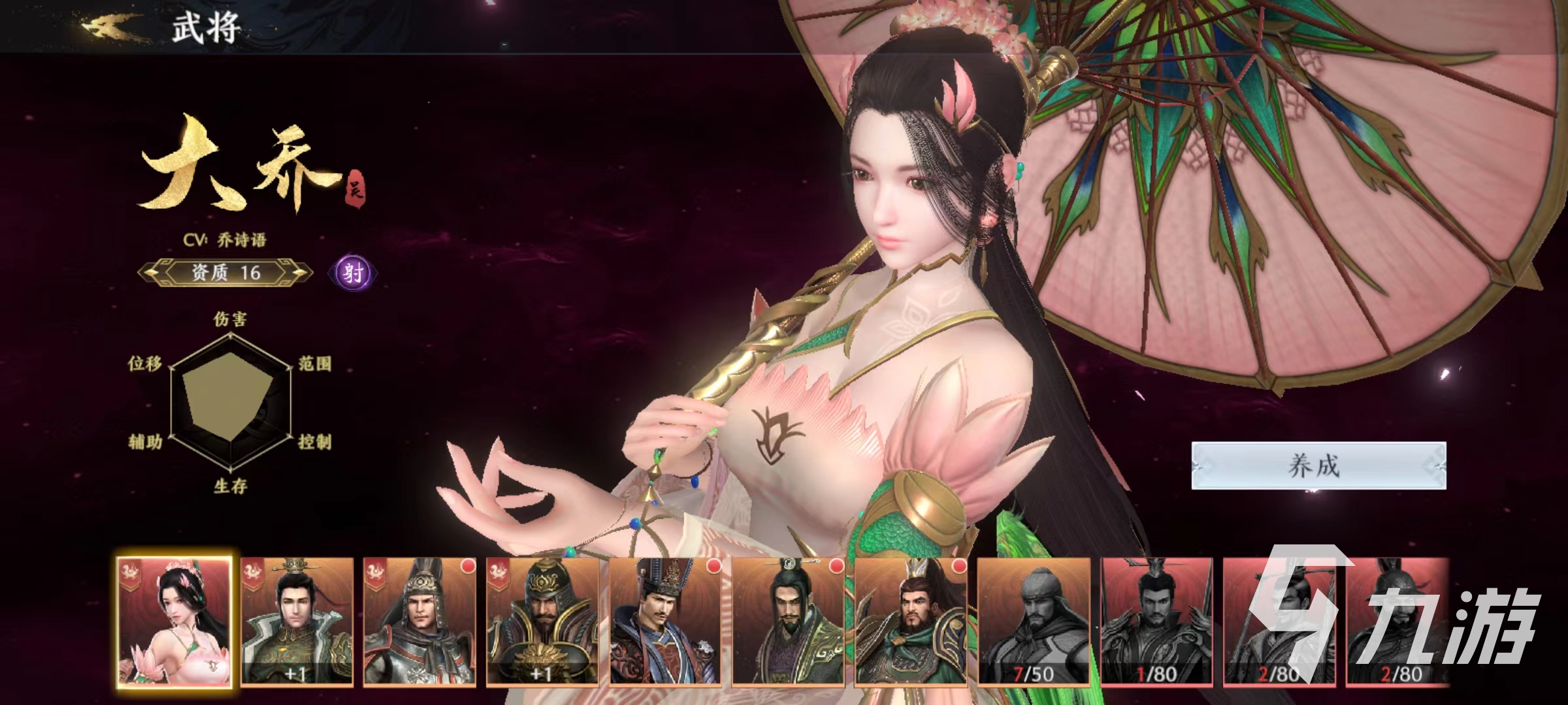 其中大喬屬于資質(zhì)16的射手武將,自身的被動(dòng)可以獲得傷害加成和速度加成,一技能是很好的位移加傷害技能,扔出傘后對路徑上的敵人造成傷害。二技能姹紫嫣紅,對指定范圍內(nèi)的敵人造成多段傷害。隨后移動(dòng)速度加快,可以控制方向向后退。無雙技能清影風(fēng)華,對范圍內(nèi)的敵人造成巨大傷害,同時(shí)還能為友軍回復(fù)血量。