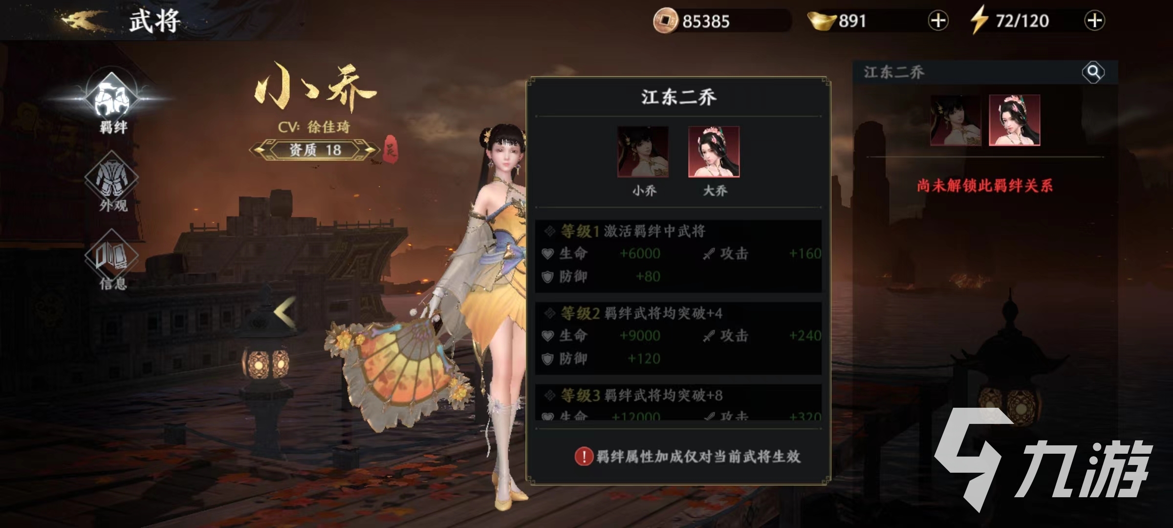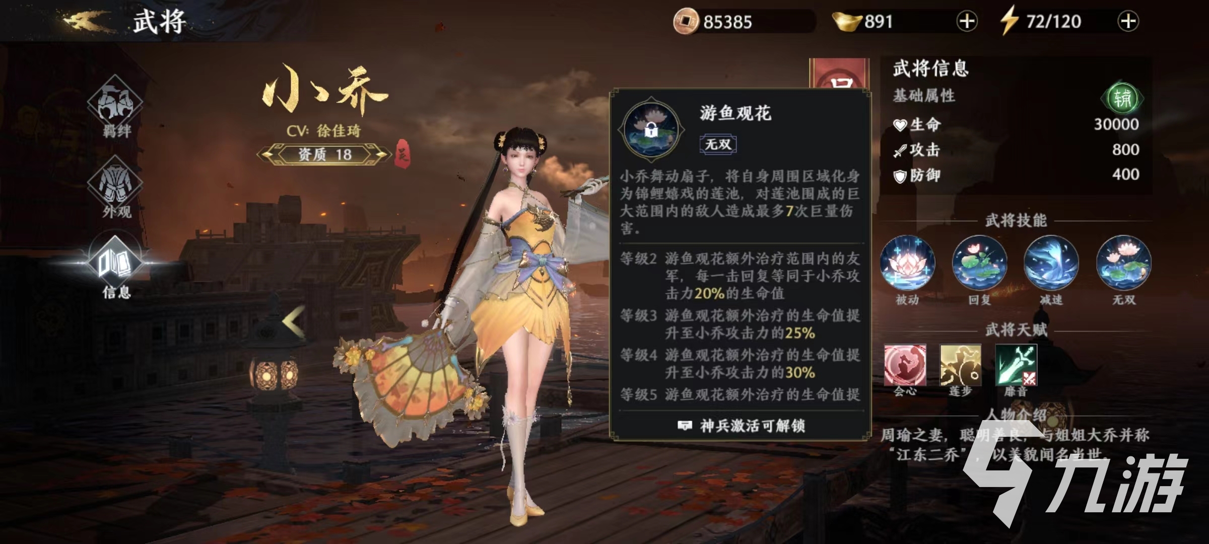 首先來介紹一下小喬的基本情況。作為資質(zhì)18點的武將,在綜合屬性上僅次于資質(zhì)20的神將,已經(jīng)是目前階段玩家可以獲得的武將天花板。自身擁有三個天賦,第1個會心可以提高己方主將暴擊率,第2個蓮步提高抗爆性,第3個靡音,能夠使小喬在攻擊敵方坦克武將時降低對方的格擋。這也是小喬可以在一定程度上克制肉盾的原因。