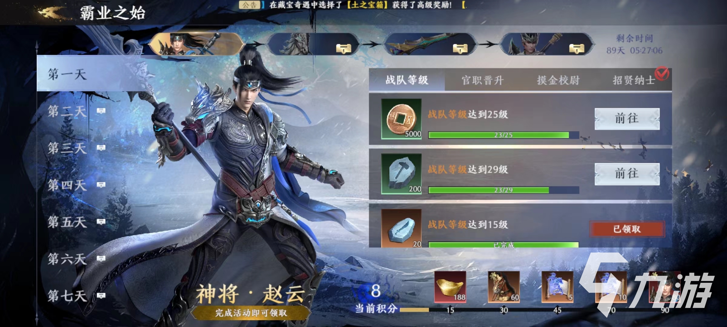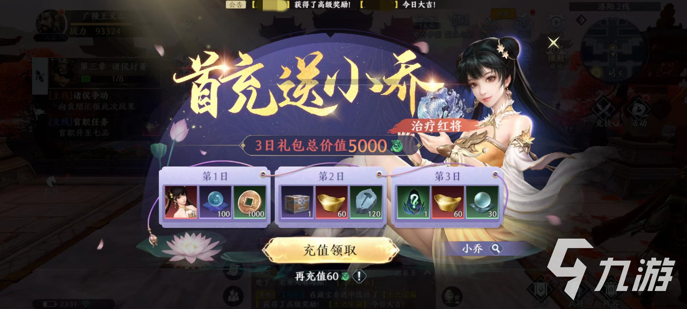 在進(jìn)入游戲中后,一定要先將首充禮包搞到手,平民玩家不需要和氪金大佬比,但是一個(gè)首充能節(jié)約很多時(shí)間。禮包在第1天就會(huì)贈(zèng)送頂級(jí)武將小喬,這是一個(gè)資質(zhì)18輔助武將,無(wú)論是前期還是后期都能稱得上是陣容核心,非常值得培養(yǎng)。同時(shí)還有突破丹,銅版,元寶,紫裝等大量獎(jiǎng)勵(lì)奉送,非常超值,這些可以使前期培養(yǎng)出一個(gè)頂級(jí)核心。