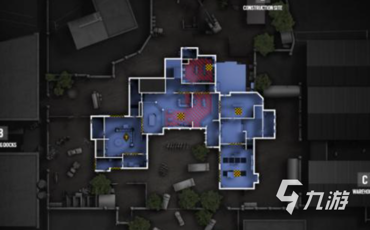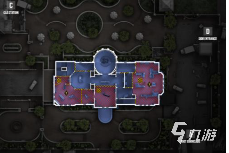 領事館二層區(qū)域中的紅色區(qū)塊面積較大,并且每個紅色區(qū)塊都有一個的可以和下層互通的黃色區(qū)域,如果進攻方率占據(jù)了三層的優(yōu)勢,則處于二層的防守方需要認真提防,對方進行卡視野的操作。
