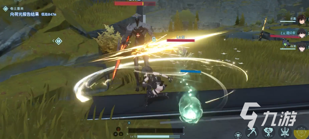 向前方發(fā)動(dòng)回旋斬?fù)簦斐晒怿Q傷害。每次命中會(huì)恢復(fù)12.5點(diǎn)光鳴能量。