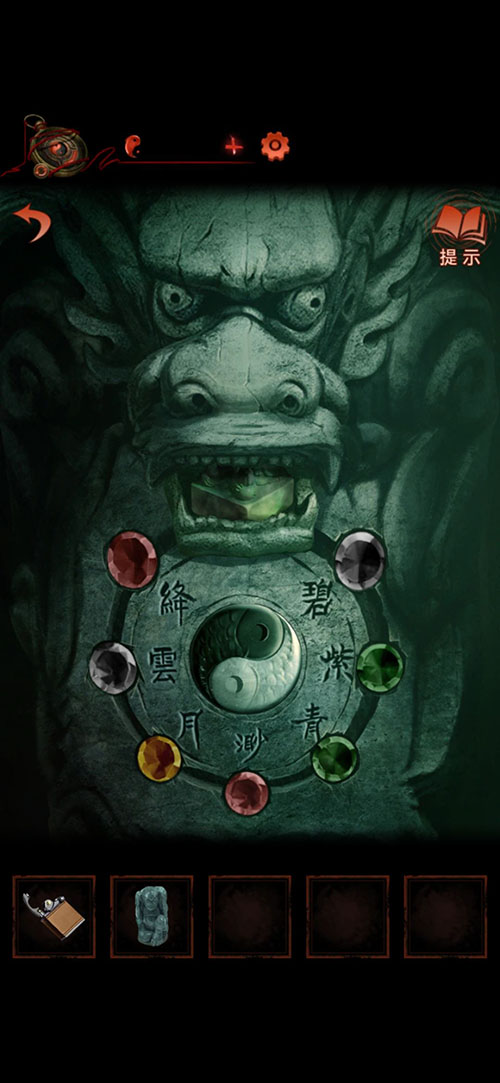 完成以后,再回到女主的視角,來到龍頭石雕處,根據(jù)第五個線索以及壁畫上的仙女裙子顏色,可以得到寶石的相應顏色,如下圖所示,就能拿到一個玉??;