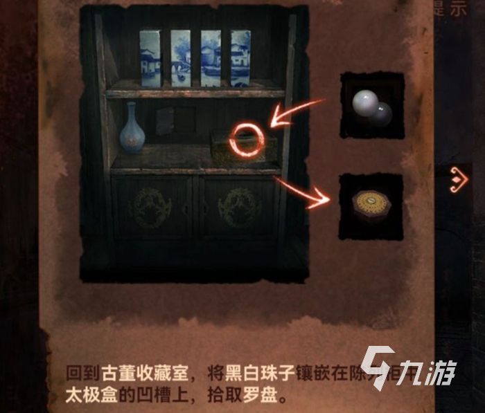 本章節(jié)我們來到古董收藏室的時(shí)候,我們需要點(diǎn)擊柜子中的盒子并且將剛剛在石敢當(dāng)?shù)裣瘾@取的的黑白小珠子放入盒子的凹槽位置,這個(gè)時(shí)候就可以將盒子打開并且獲取重要的道具羅盤。