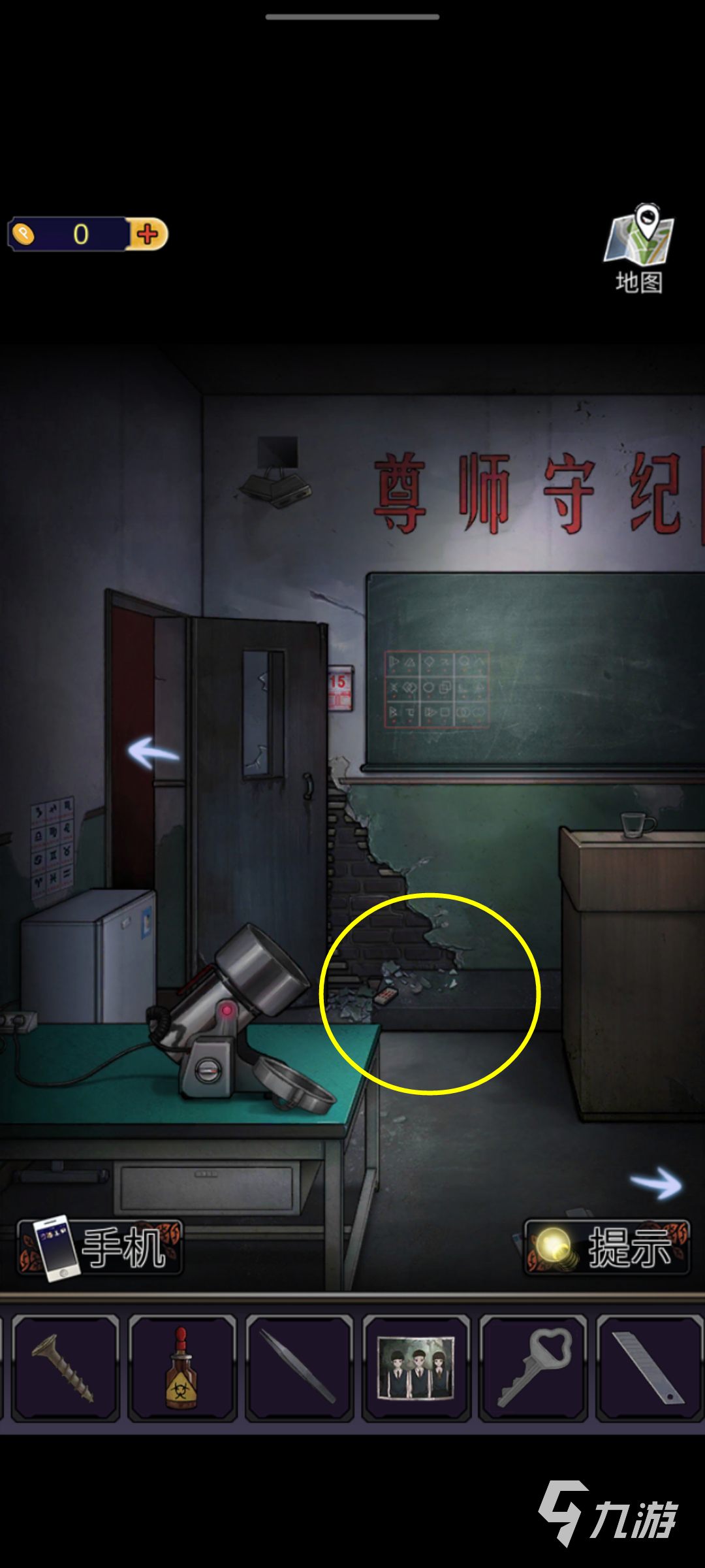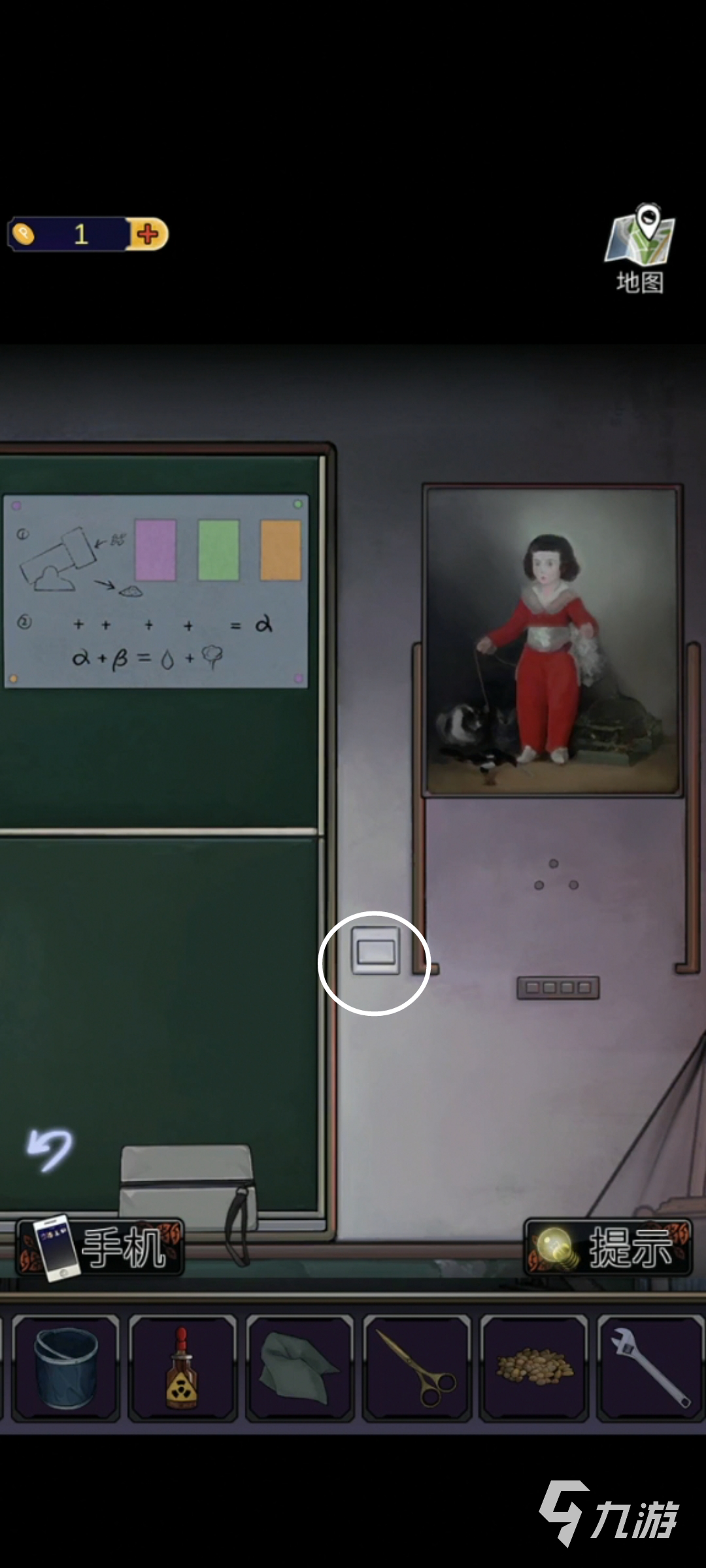 3、點擊理化教室的黃圈處,就能獲得【密碼盒子】。這個盒子是最坑爹的。我們需要再后來解鎖美術(shù)教室后,點擊白圈處的開關(guān),將燈關(guān)掉查看黑板才能獲得線索。將密碼盒子調(diào)成如荼的樣子,就能解鎖出來了。只需要對上面的三個顏色進行調(diào)整,兩三下就好了。
