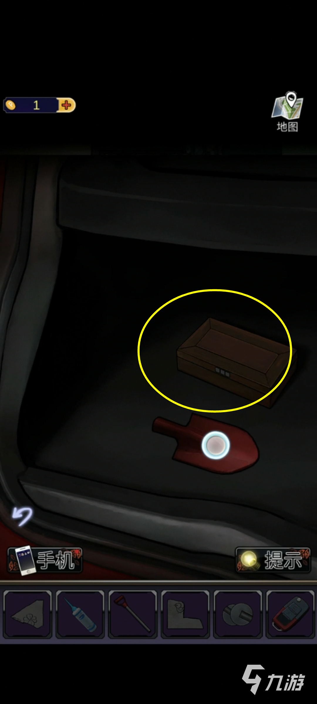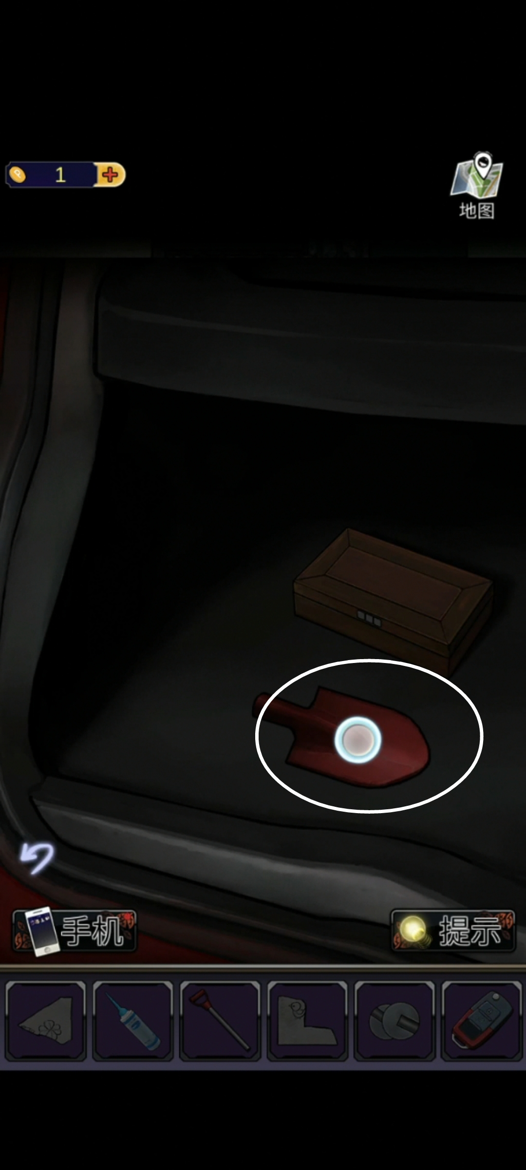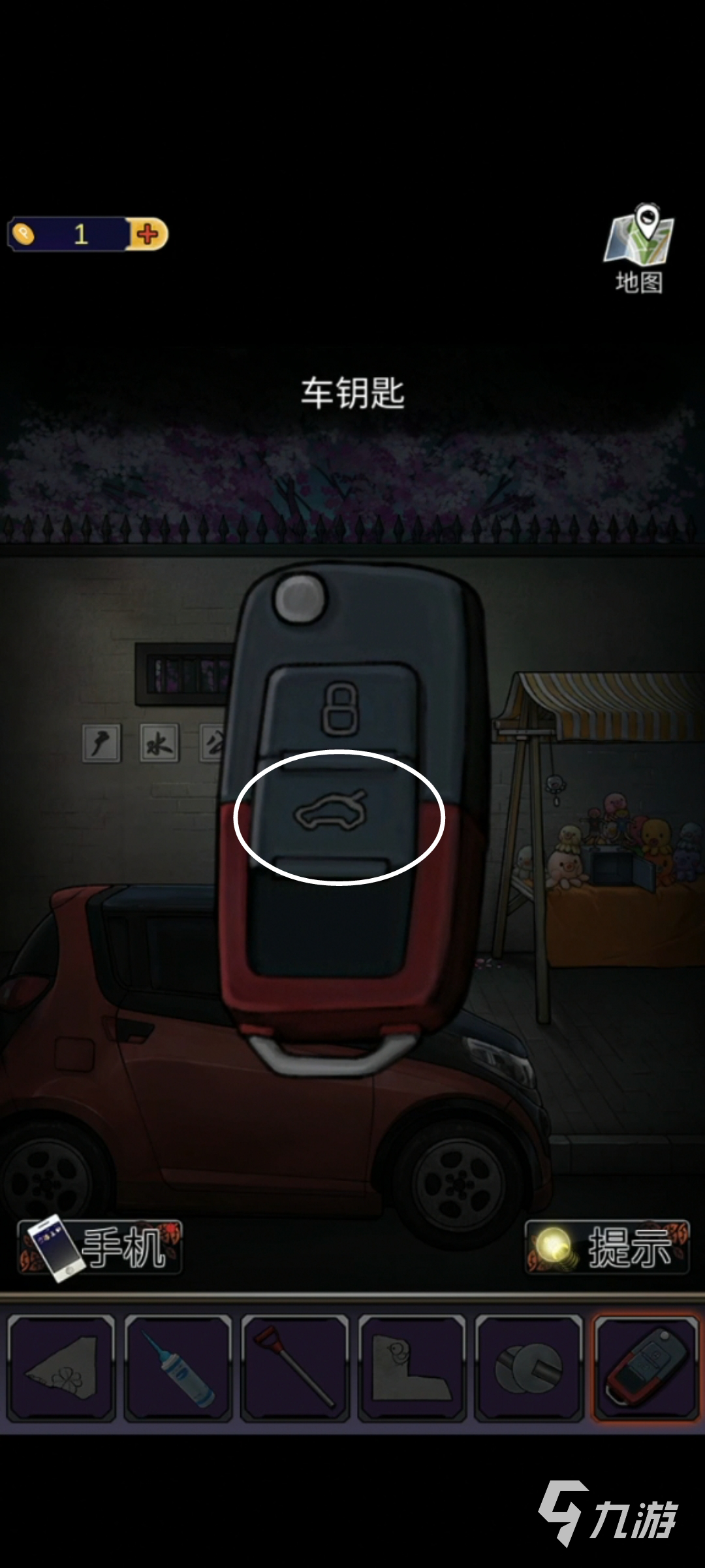 7、然后點(diǎn)擊物品欄中的車(chē)鑰匙,點(diǎn)擊白圈圈住的地方打開(kāi)后備箱,獲得道具【鏟子頭部】。