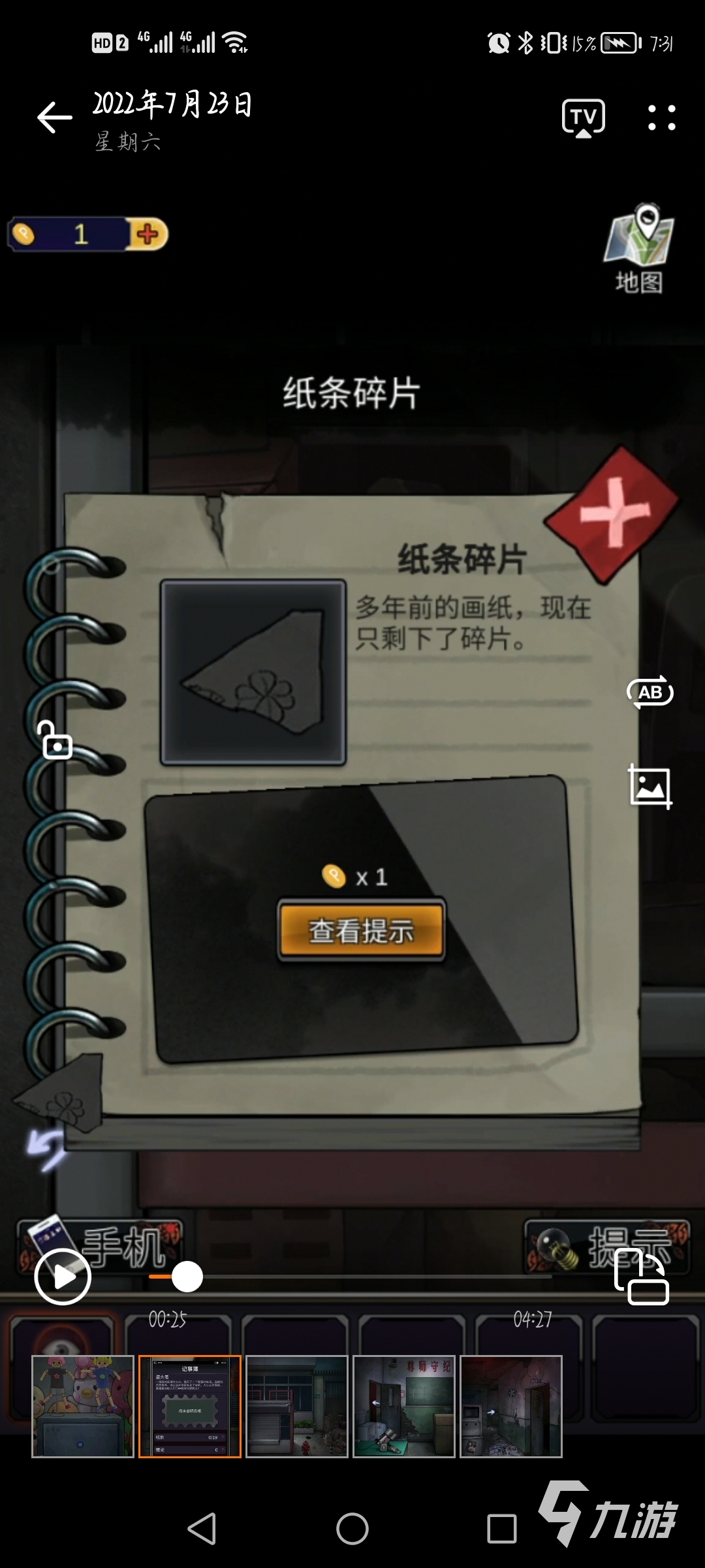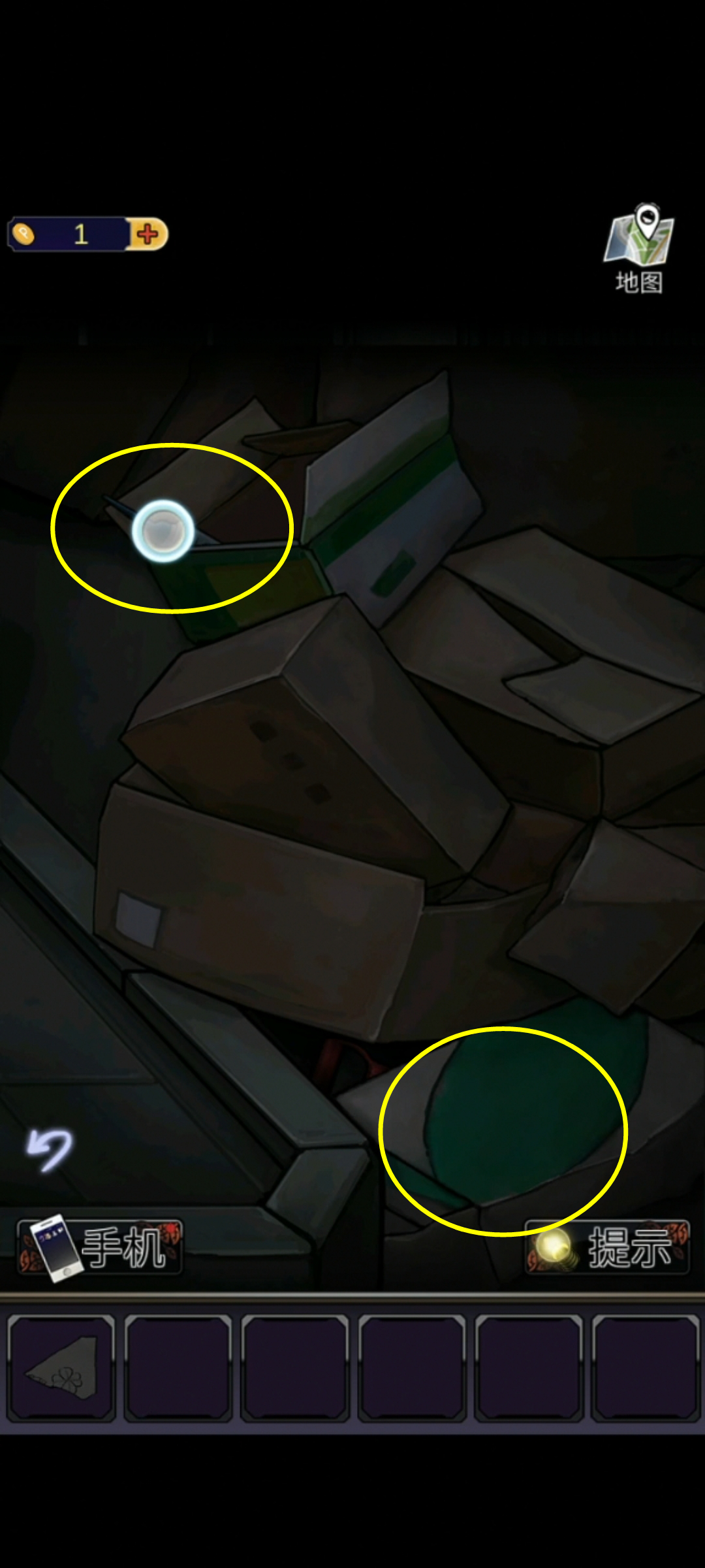 1、點(diǎn)擊左邊的箭頭,來(lái)到街道四段。點(diǎn)擊圖中黃色圈住的地方,獲得道具【紙條碎片】【鏟子柄】【機(jī)油】。