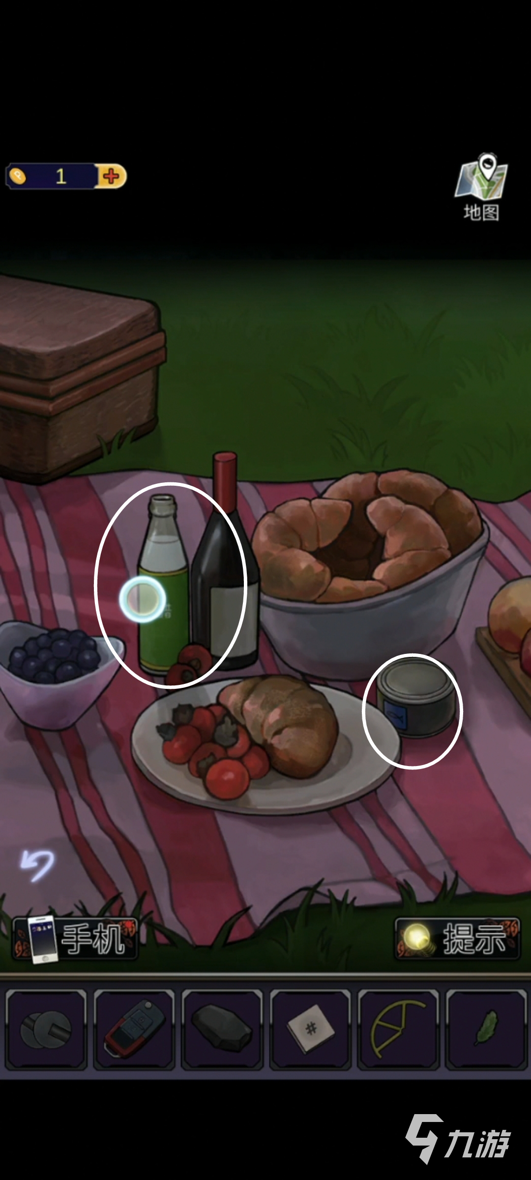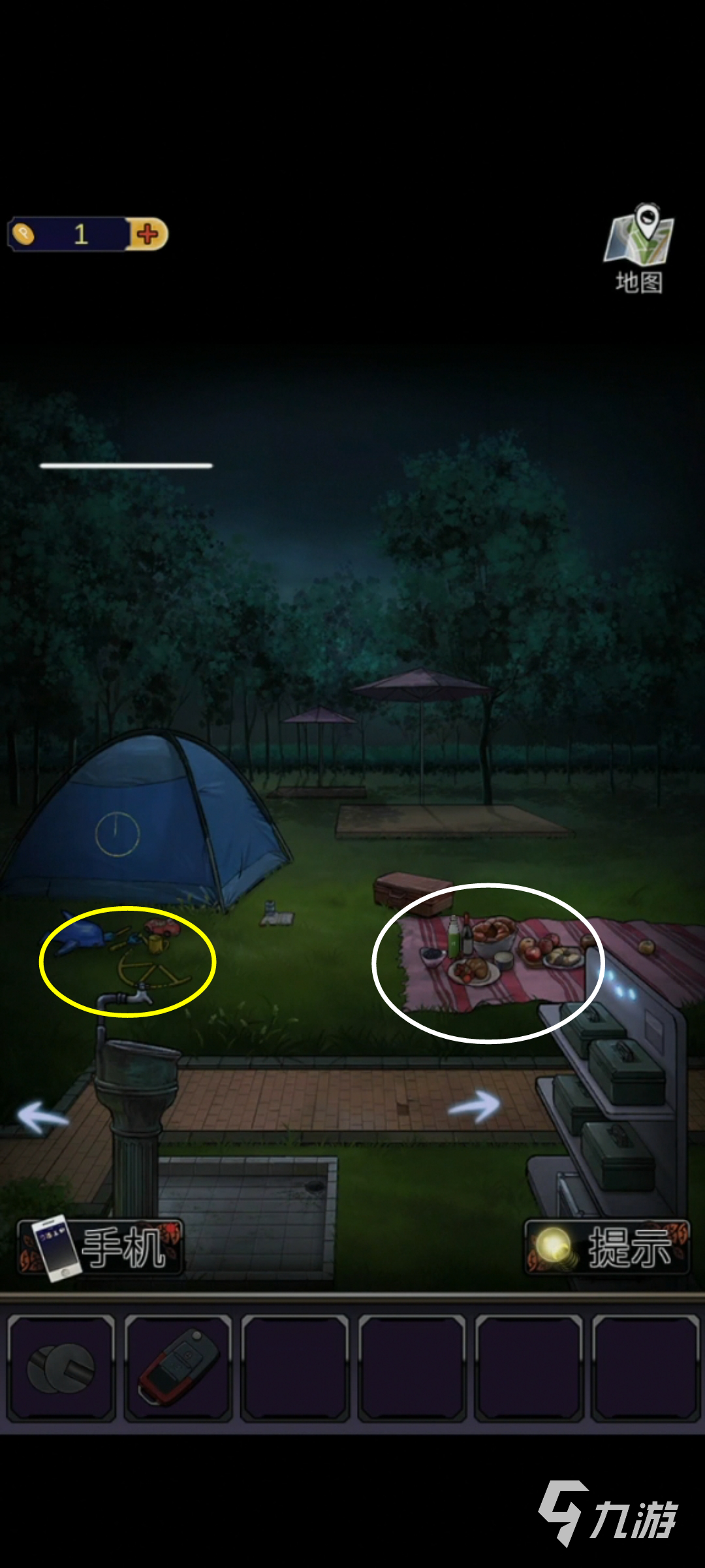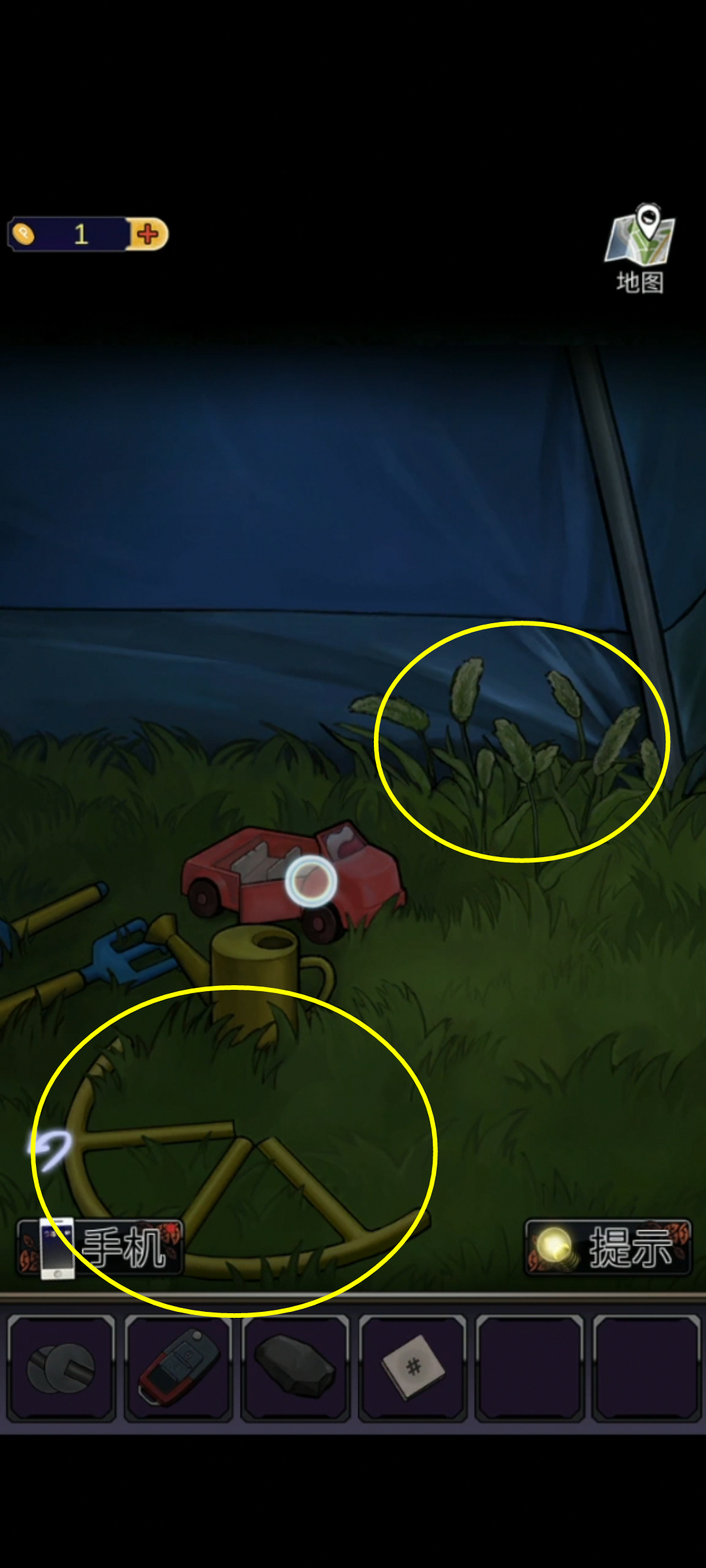 16、來(lái)到野餐營(yíng)地,點(diǎn)擊黃圈位置,獲得【轉(zhuǎn)盤(pán)零件】,【狗尾草】,點(diǎn)擊白圈位置,獲得【白醋】和【罐頭】。