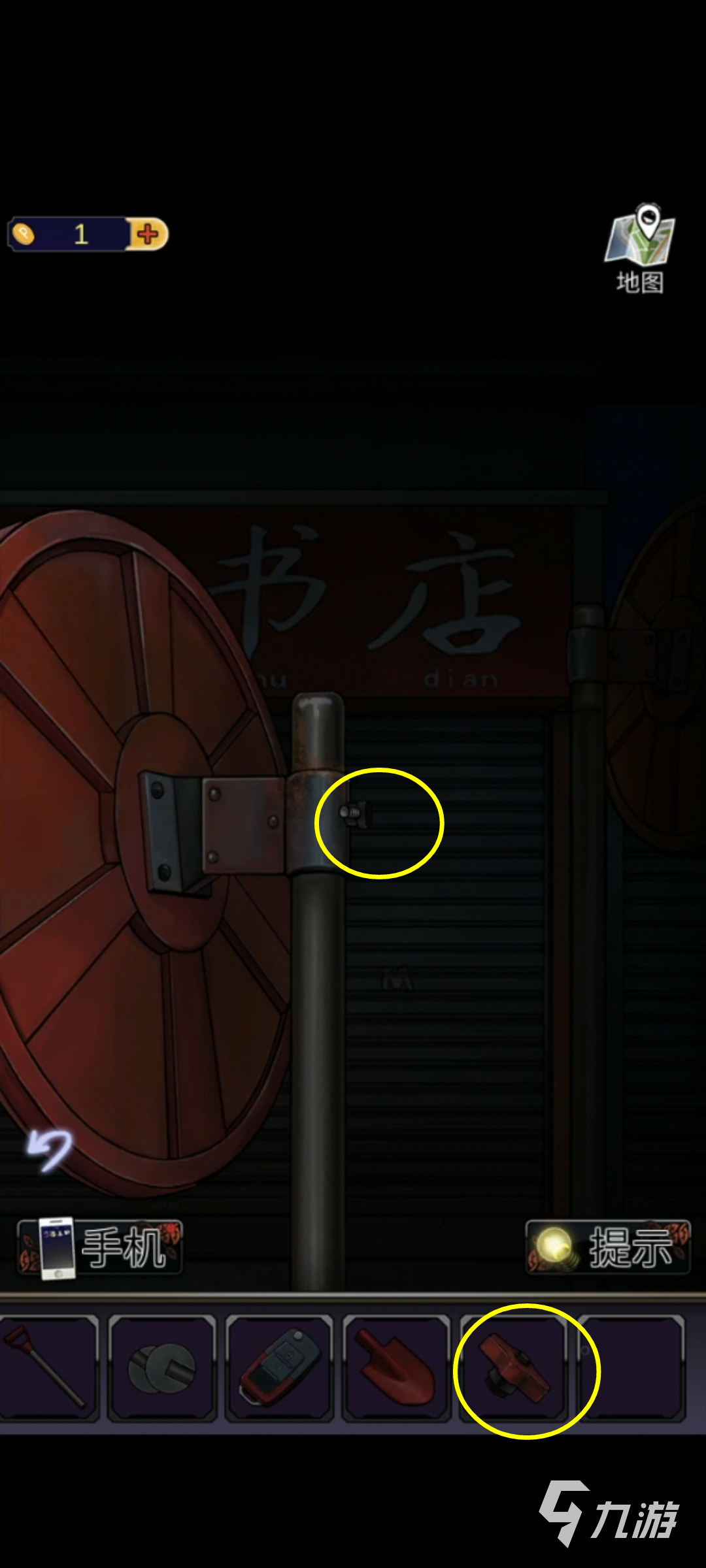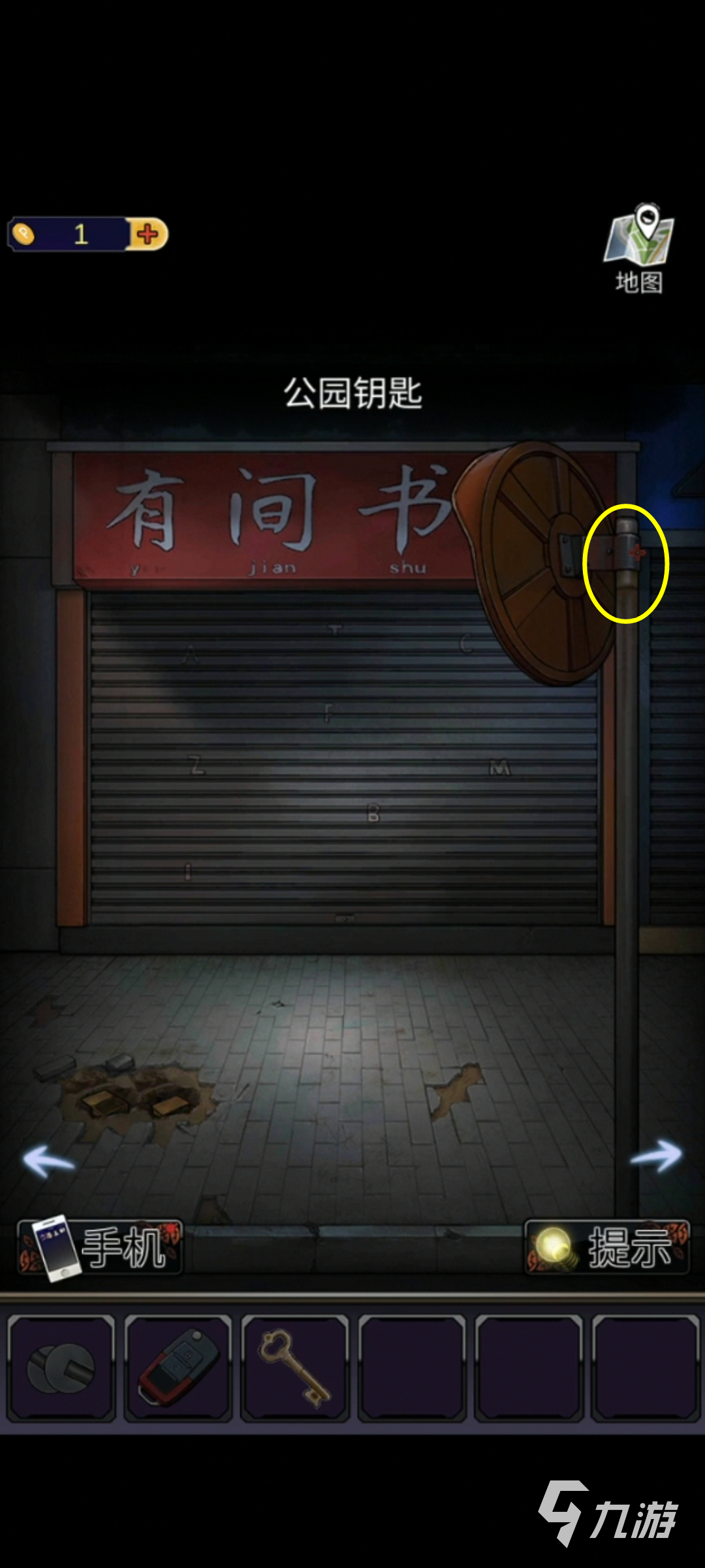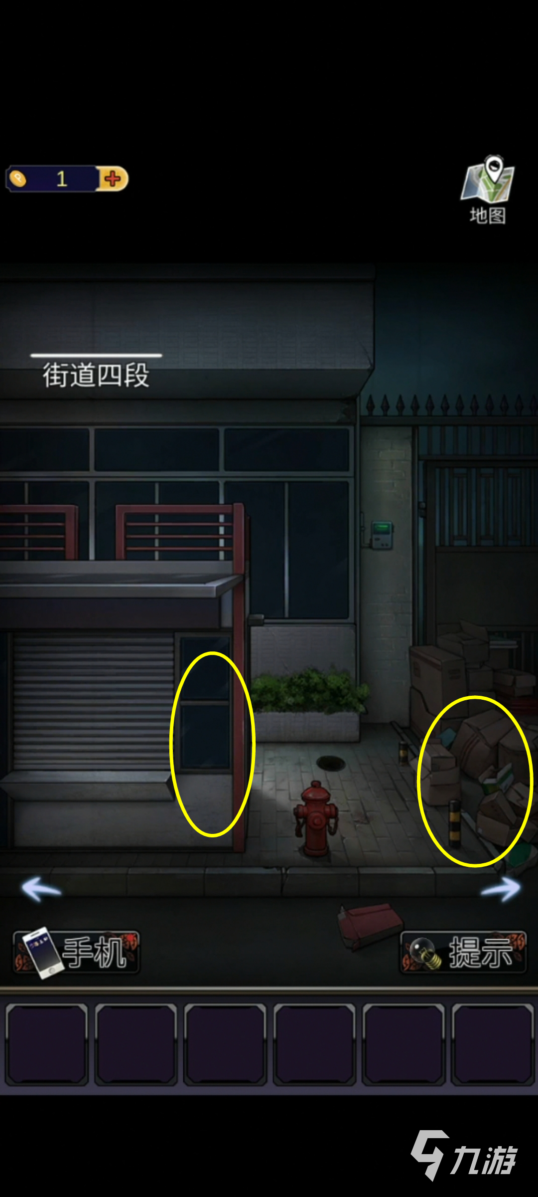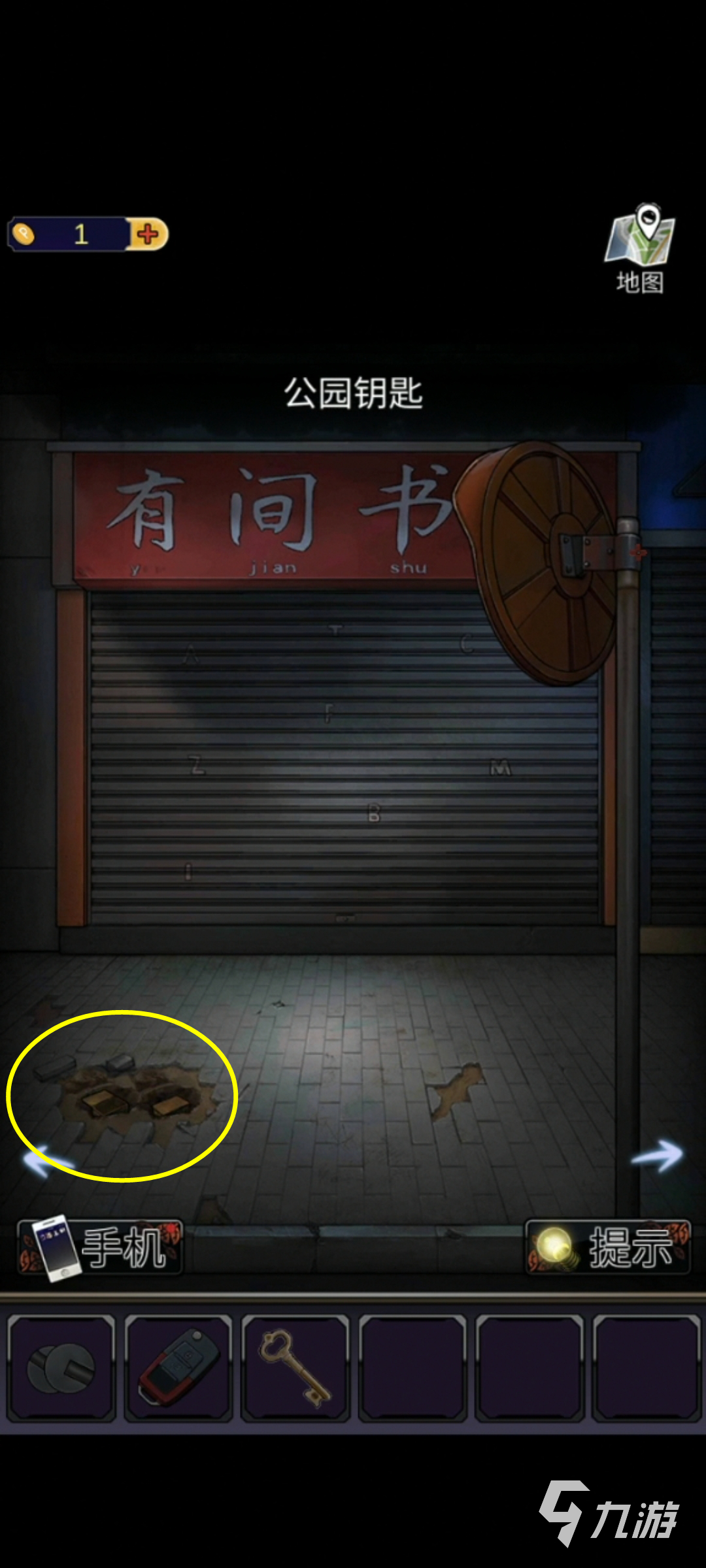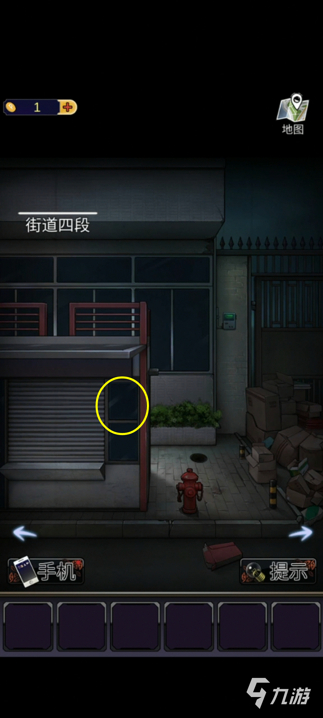 10、回到報(bào)刊亭的街道四段,點(diǎn)擊黃色圈圈住的位置,用鑰匙打開(kāi)玻璃門(mén),得到【閥門(mén)】。