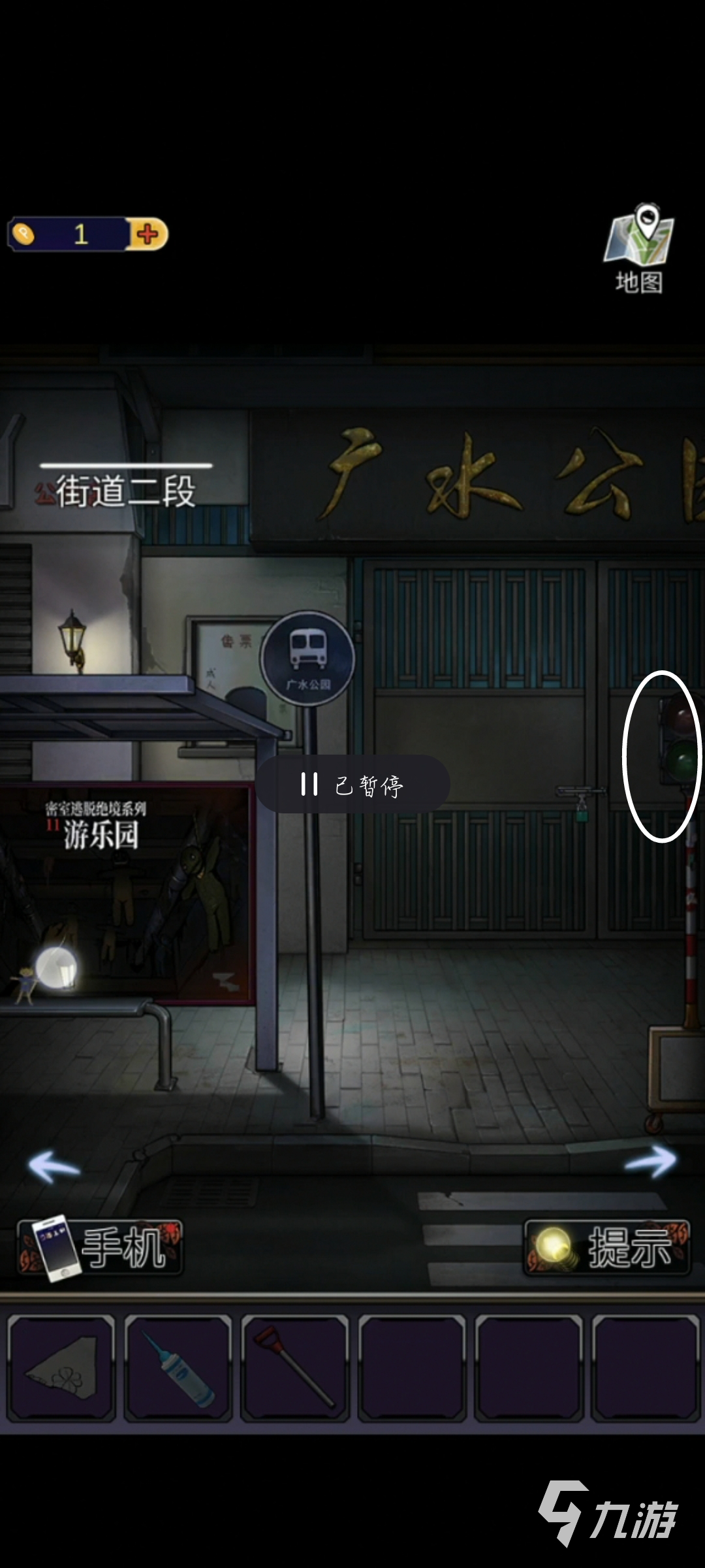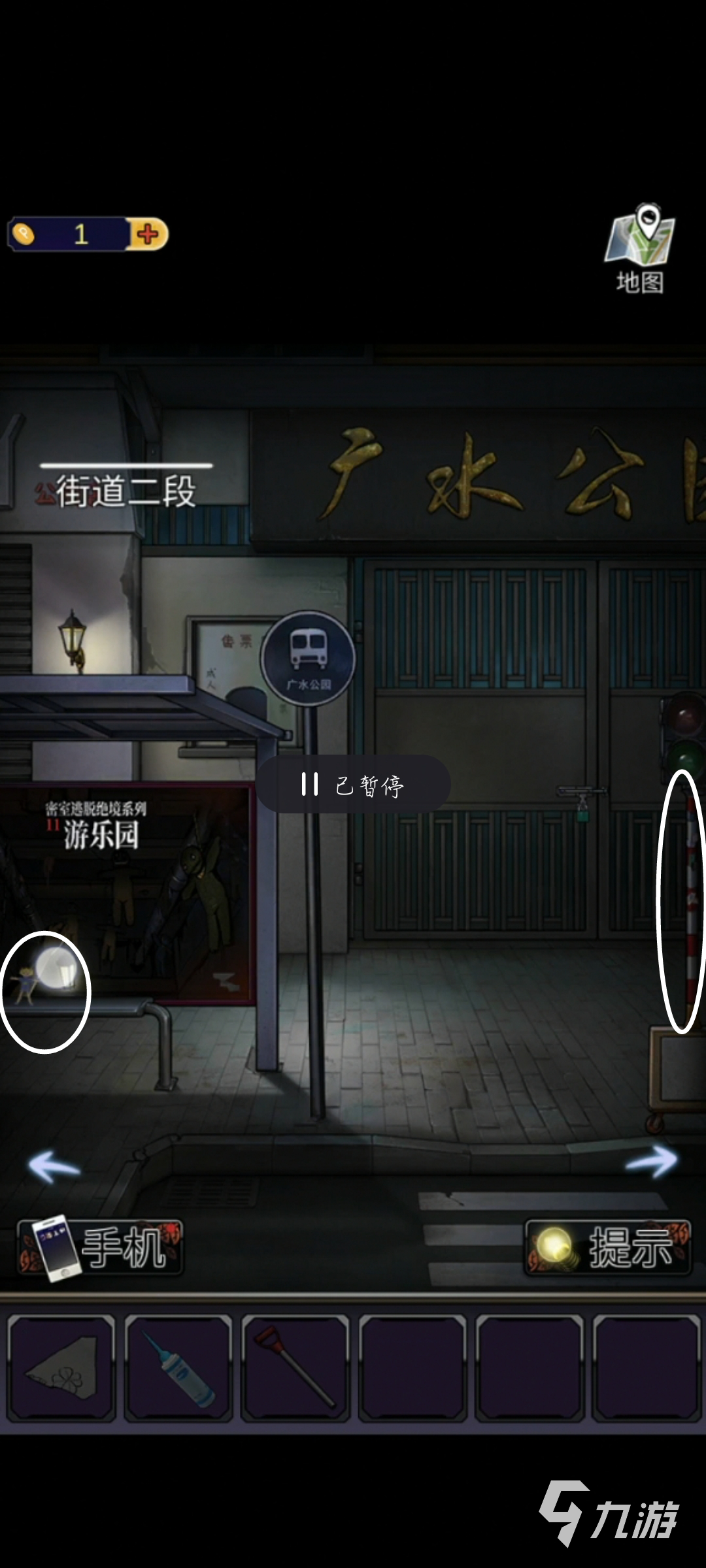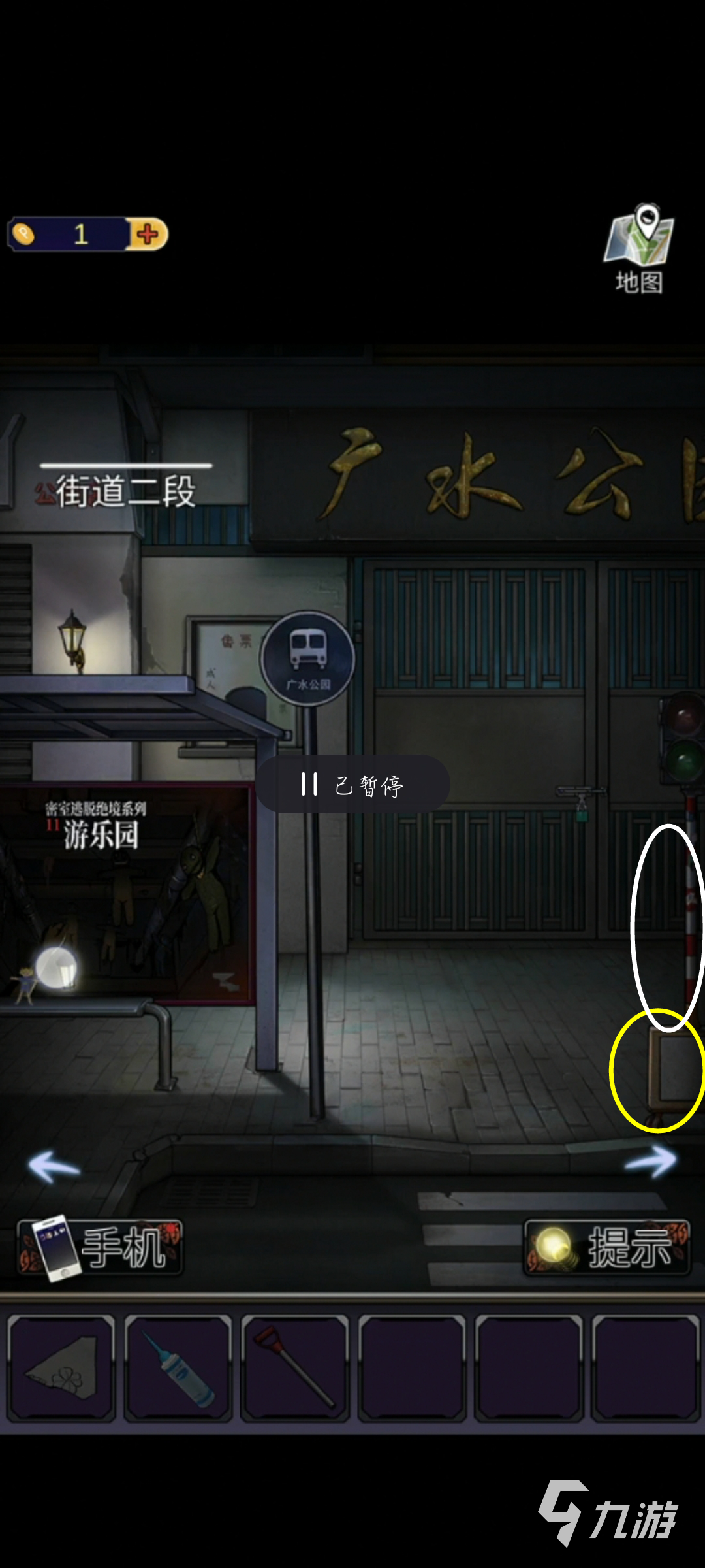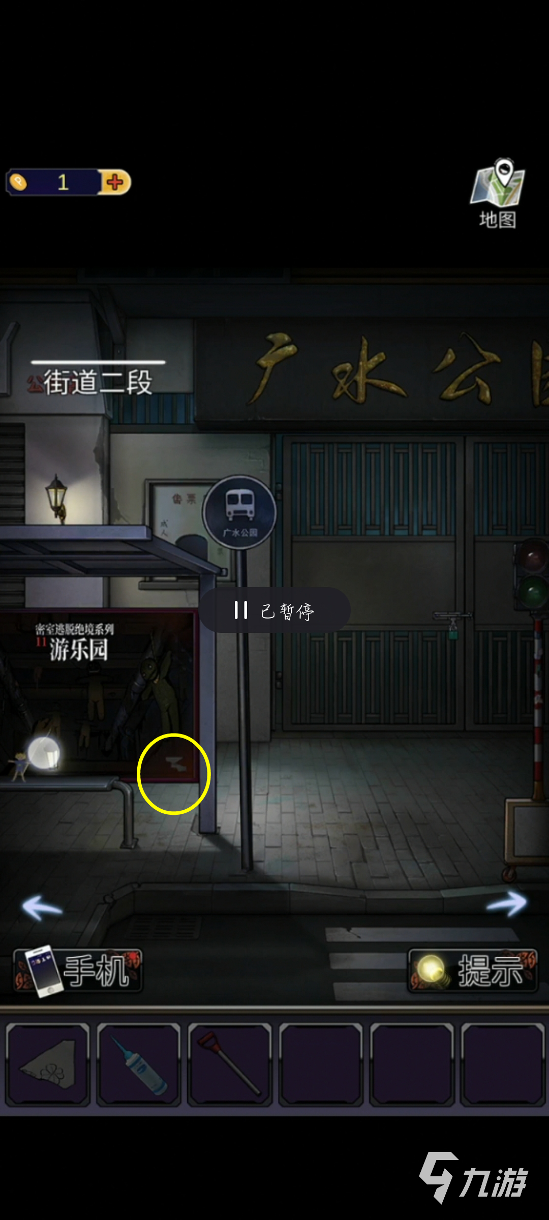 10、回到報(bào)刊亭的街道四段,點(diǎn)擊黃色圈圈住的位置,用鑰匙打開(kāi)玻璃門(mén),得到【閥門(mén)】。