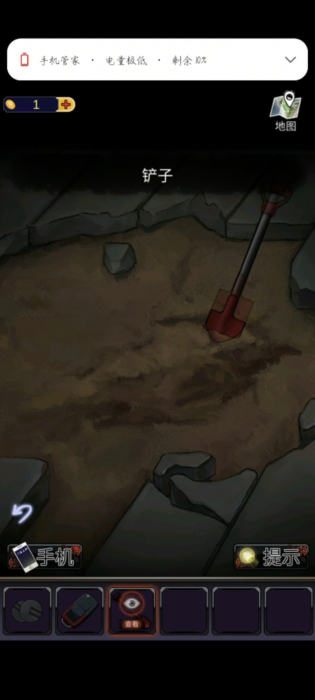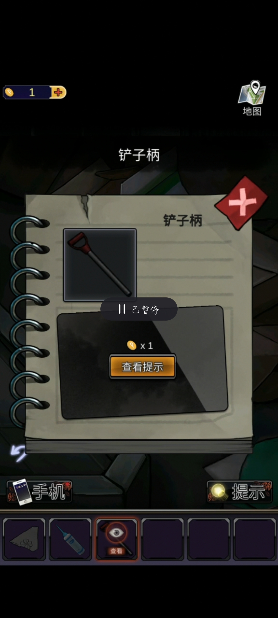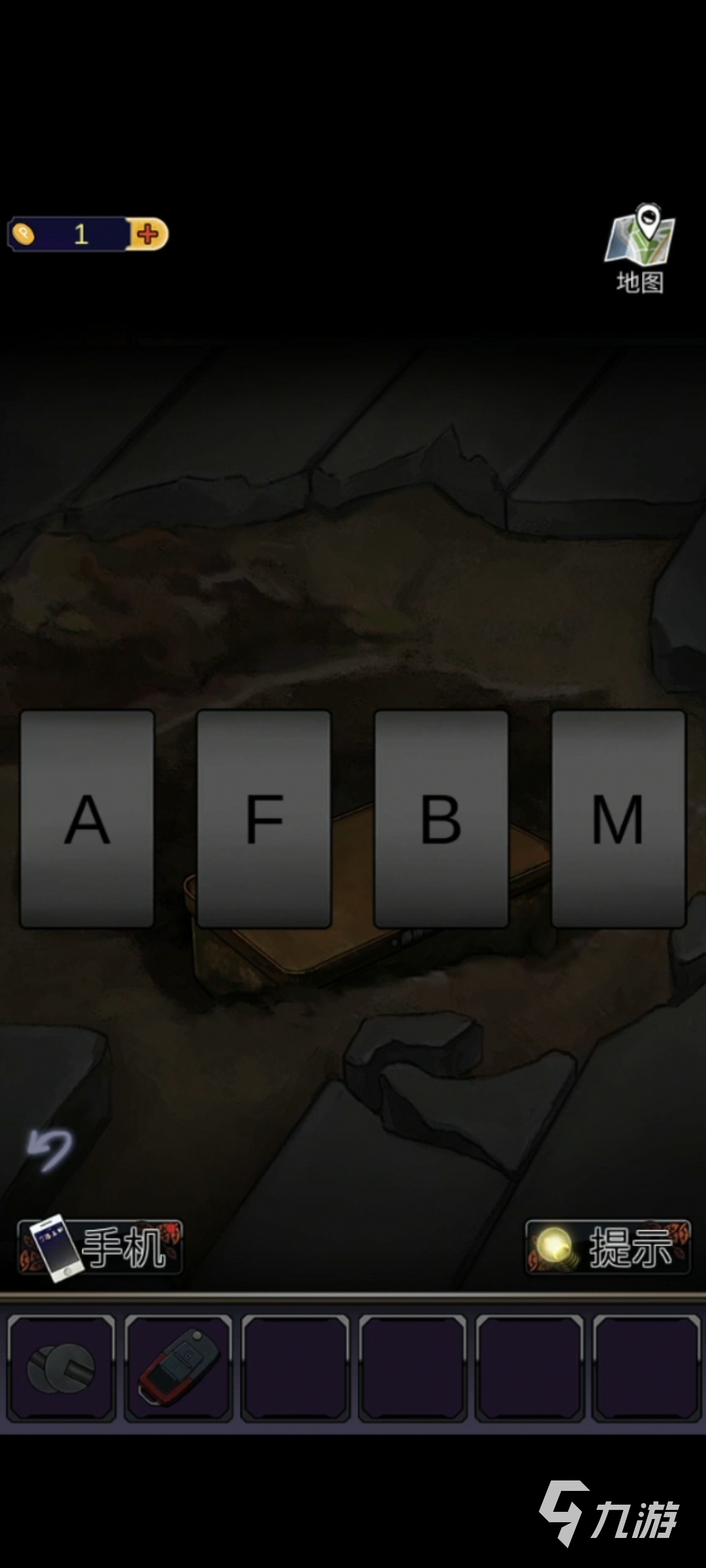 12、返回,將【鏟子頭部】和【鏟子柄】結(jié)合起來(lái),得到【鏟子】,然后用【鏟子】對(duì)著黃圈圈出的土使用,挖出一個(gè)密碼箱子。輸入密碼【AFBM】,得到【鑰匙】。