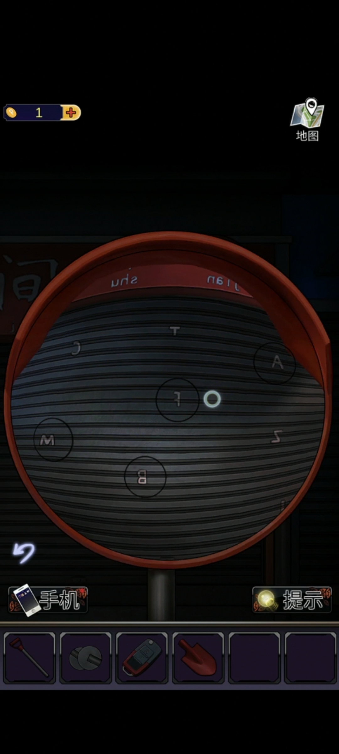 11、回到有間書(shū)店門(mén)口,點(diǎn)擊黃色圈圈住的位置,放置【閥門(mén)】之后,再使用【機(jī)油】,修復(fù)廣角鏡。然后得到線(xiàn)索【AFBM】。