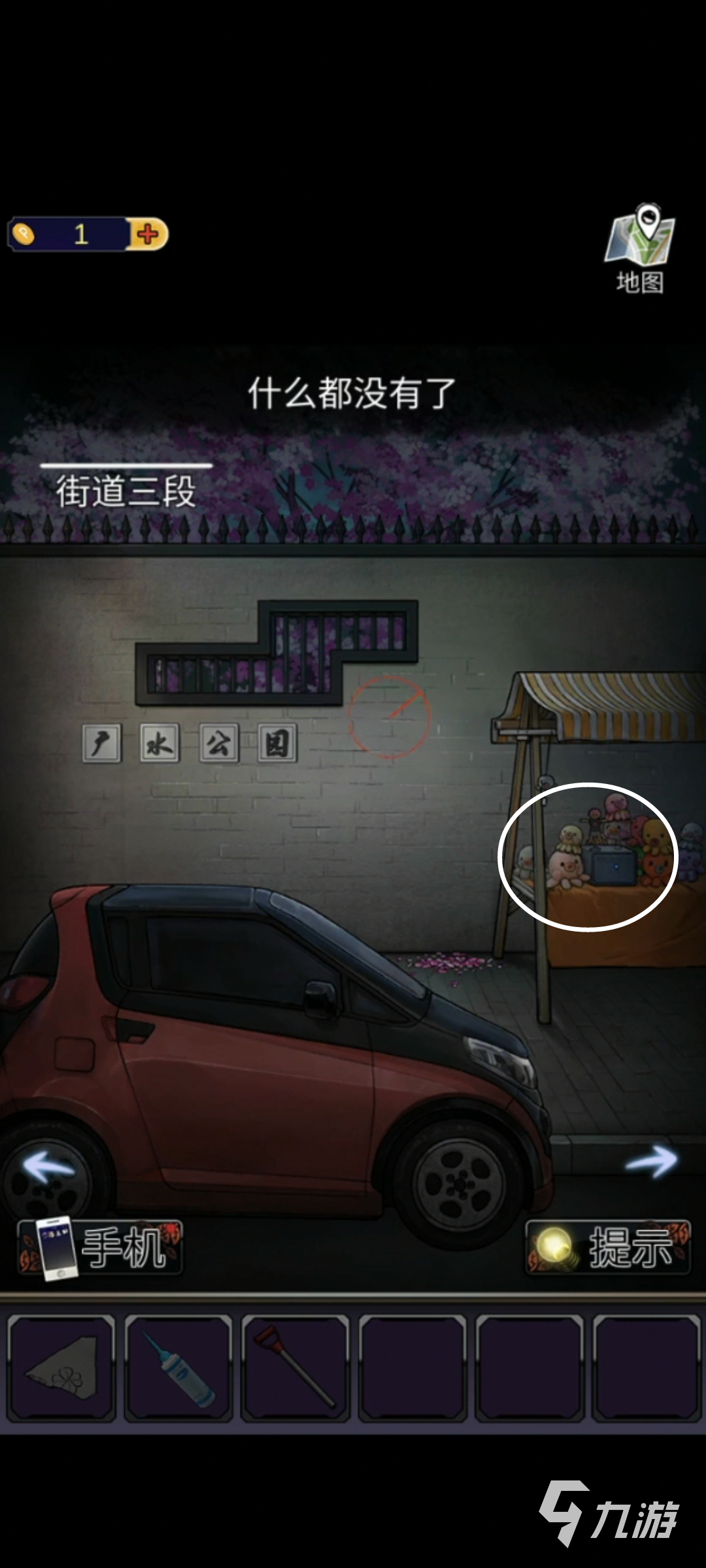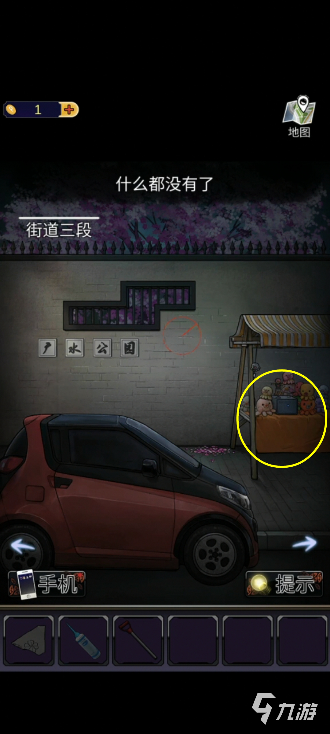 3、來(lái)到有紅色車(chē)輛的街道,點(diǎn)擊黃圈所標(biāo)記的位置,獲得【旋鈕】。
